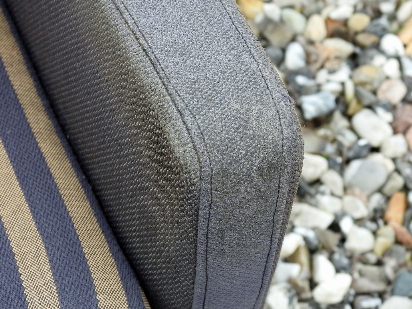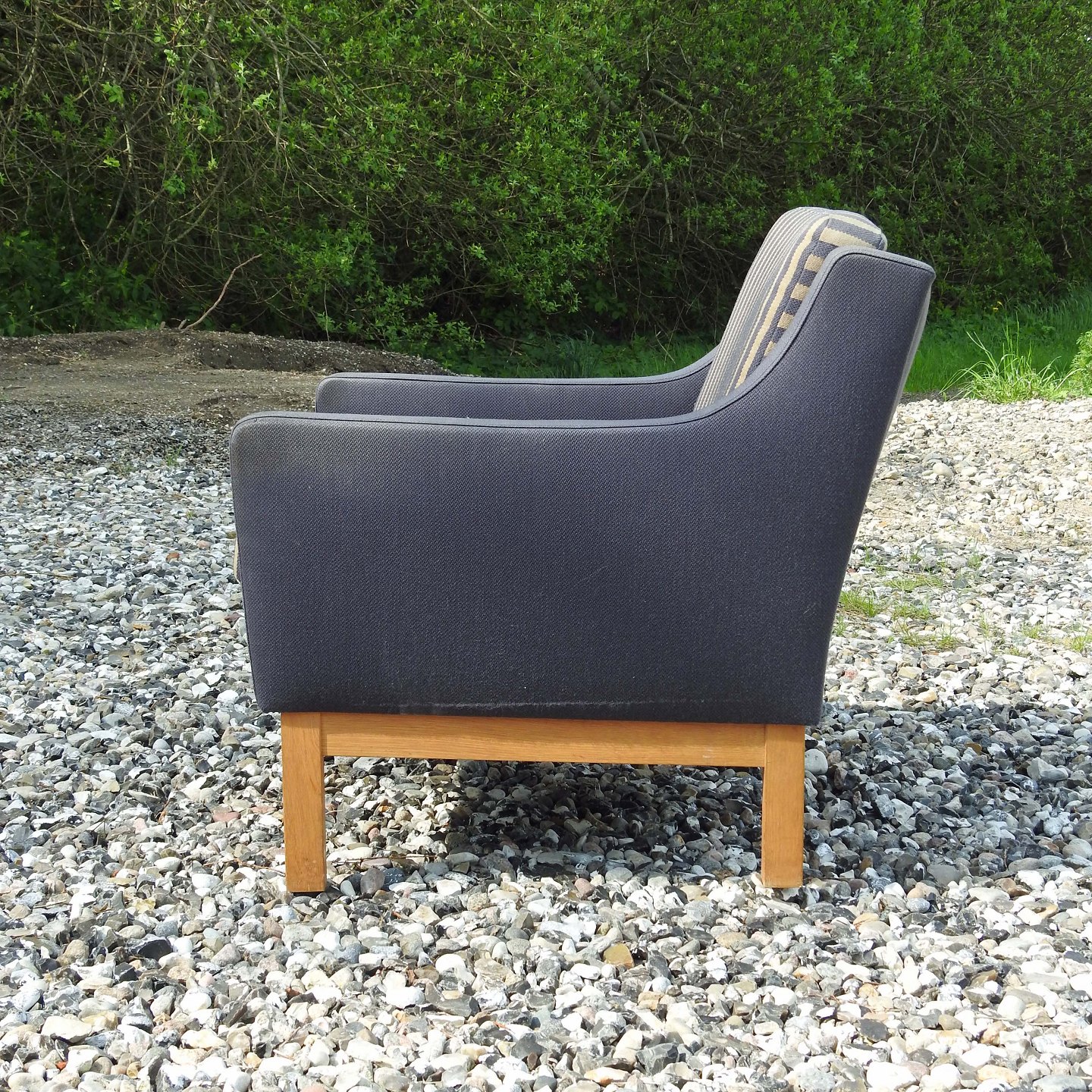 Lænestol med stel i egetræ med stofpolstret hynder i blå og råhvide farver