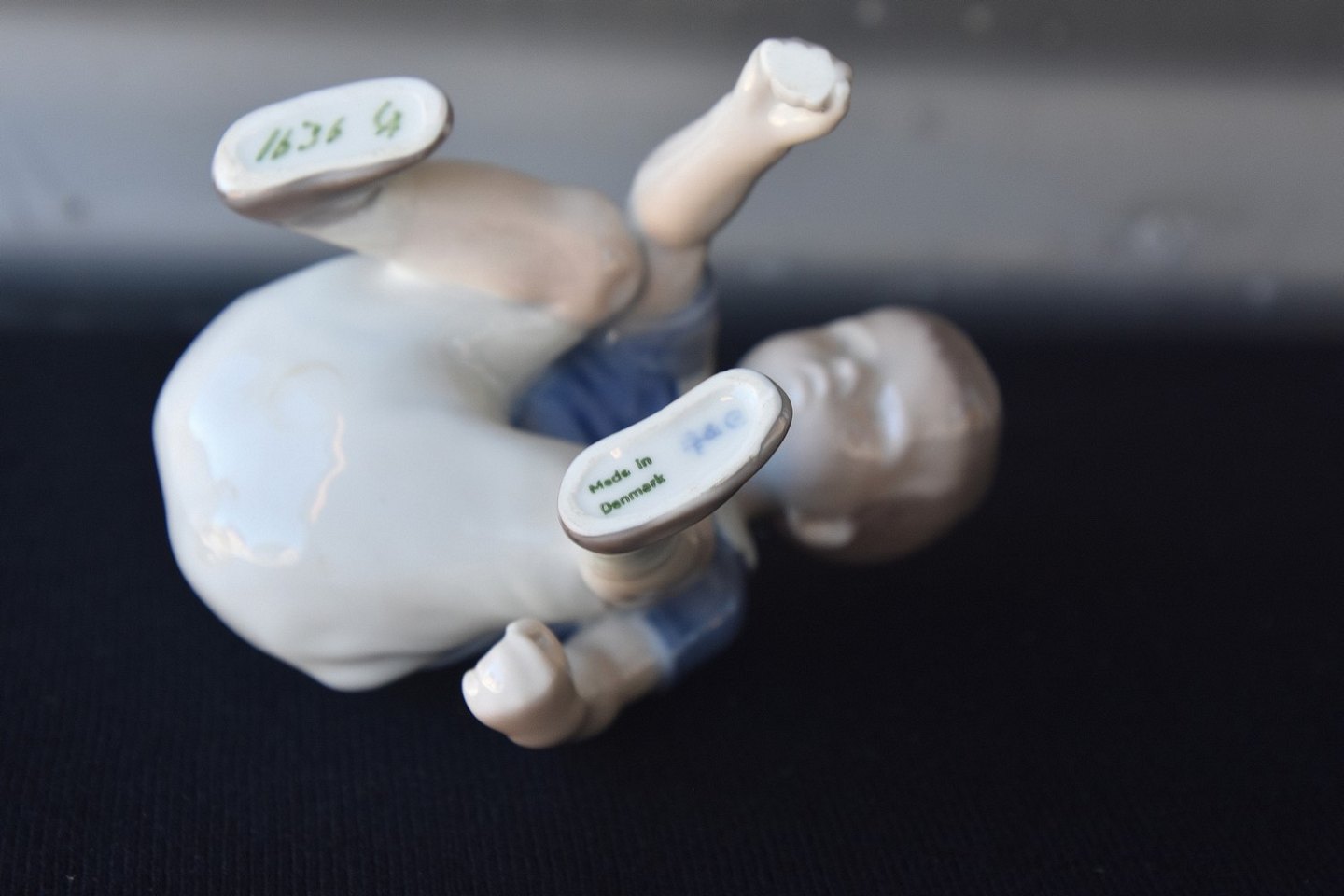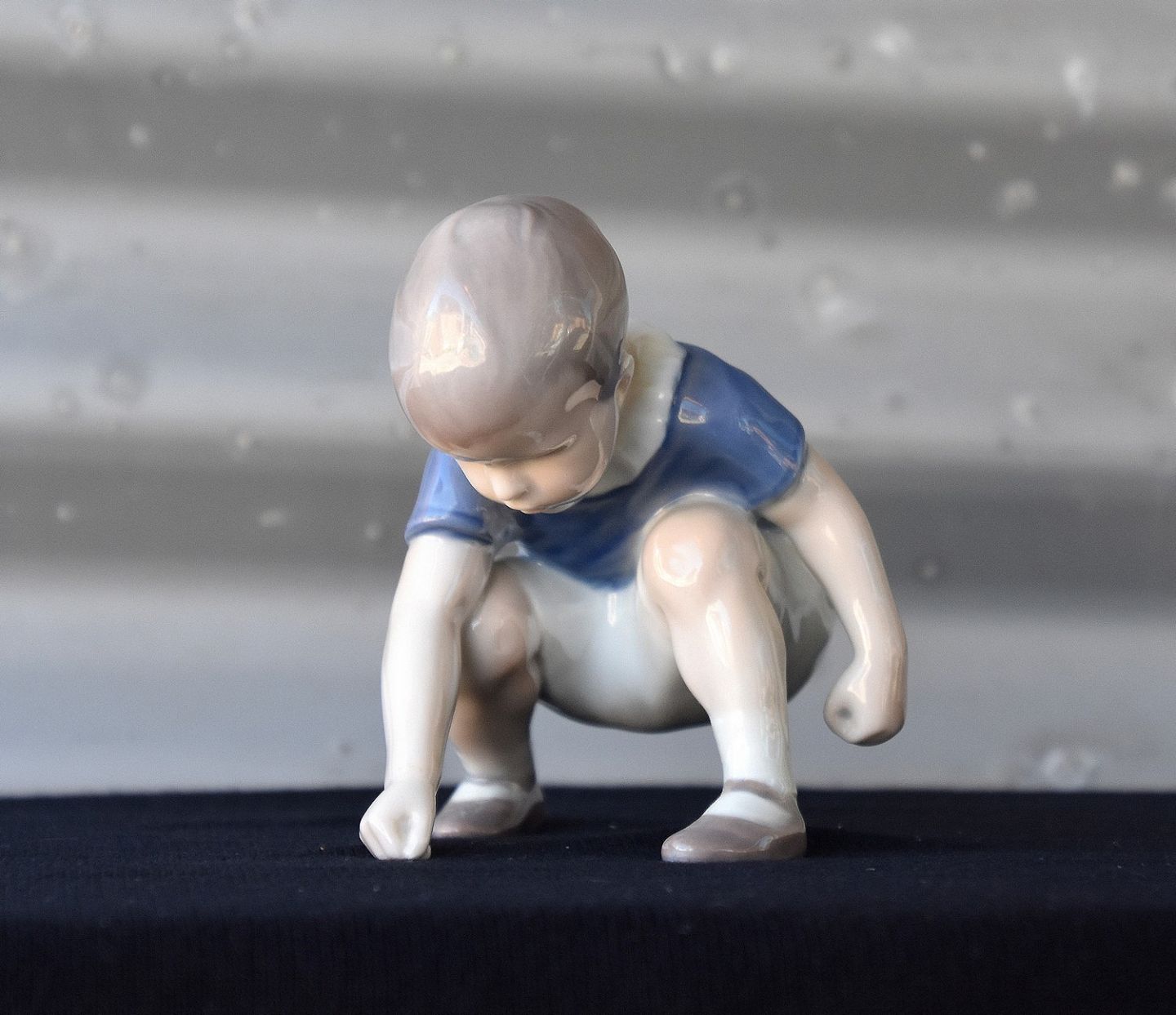 Figur i porcelæn med motiv af drengen Dickie siddende på hug. Nr. 1636 Drengen med gås.