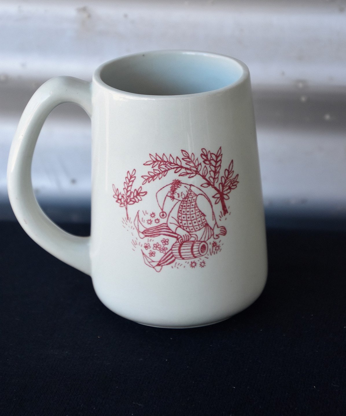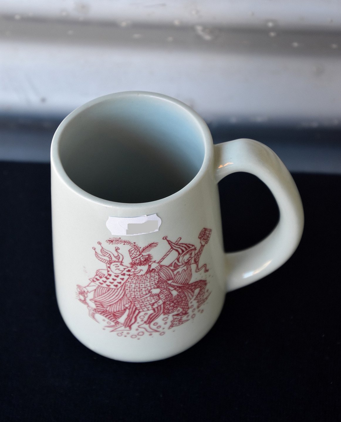 Fajance krus, nr. 1879-292. Dekoreret med rød streg, der viser fordrukne karnevals folk