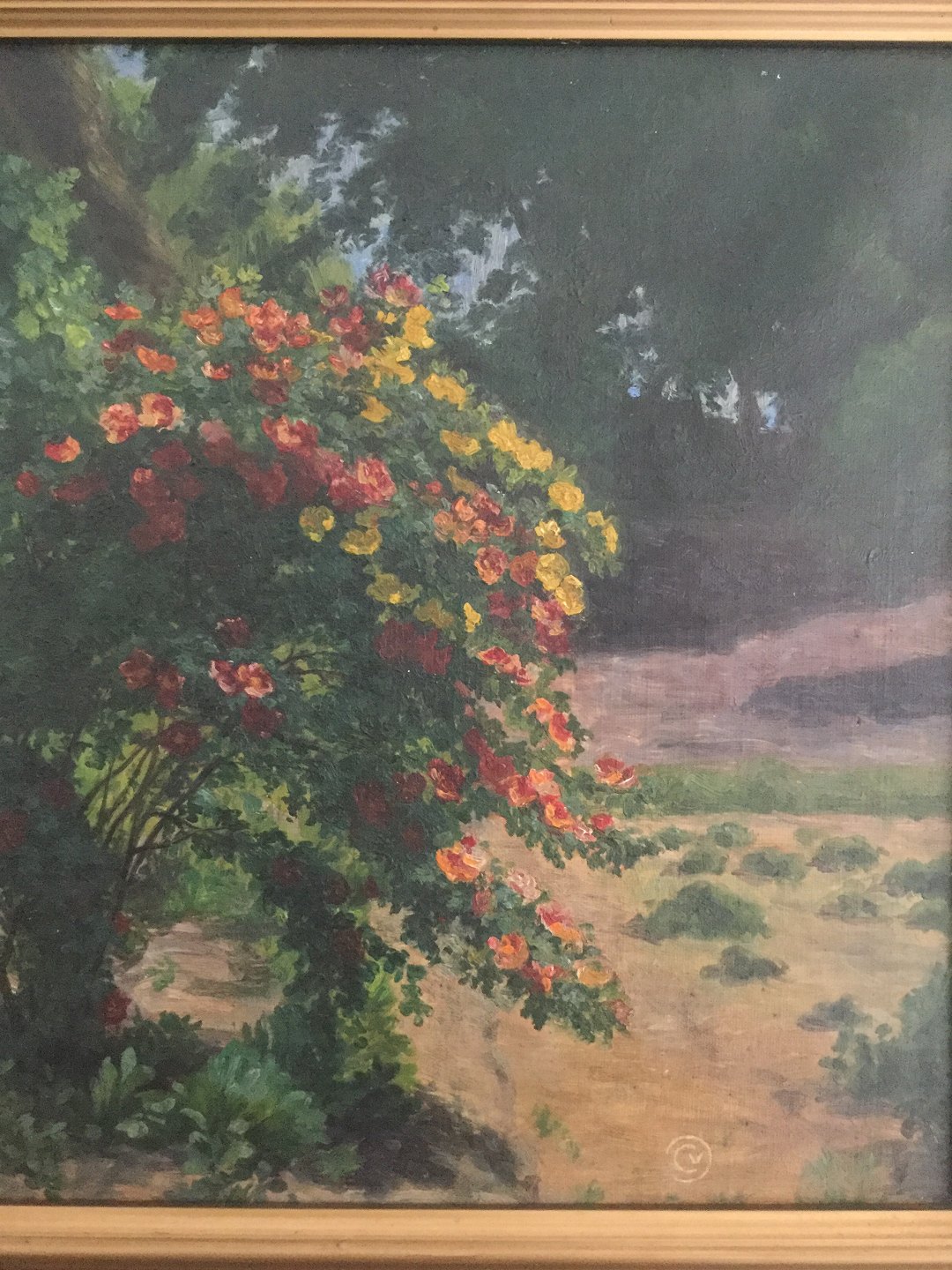 Bagpå blindramme - Caroline van Deurs og "En Rosenbusk" samt gamle auktions mærkater.