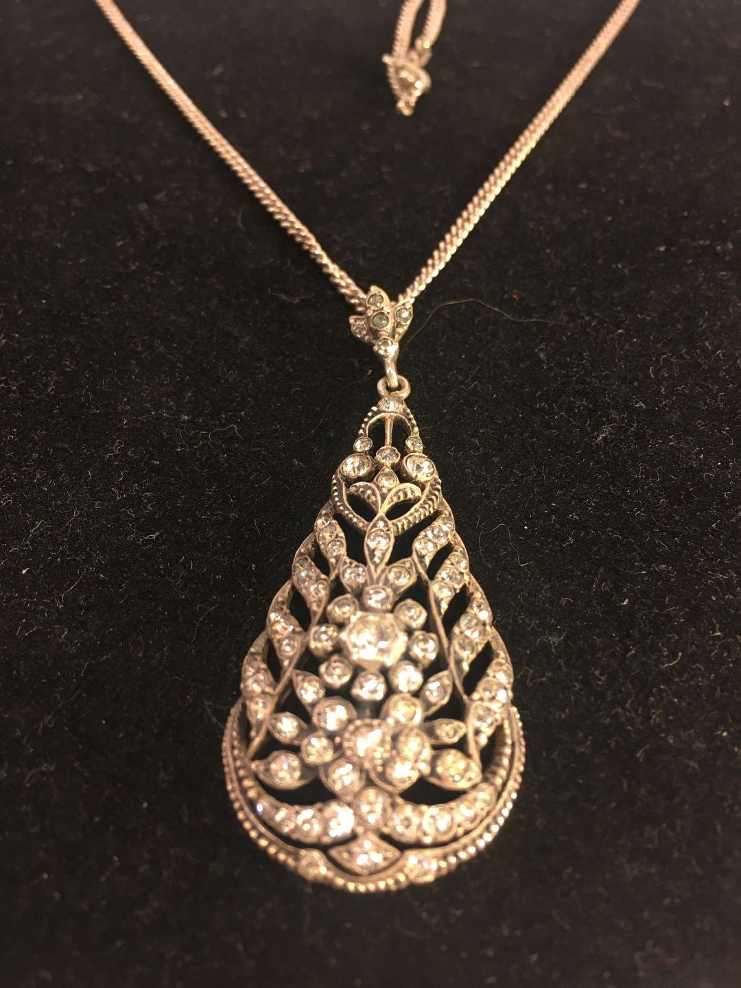 Necklace with drop-shaped pendant.