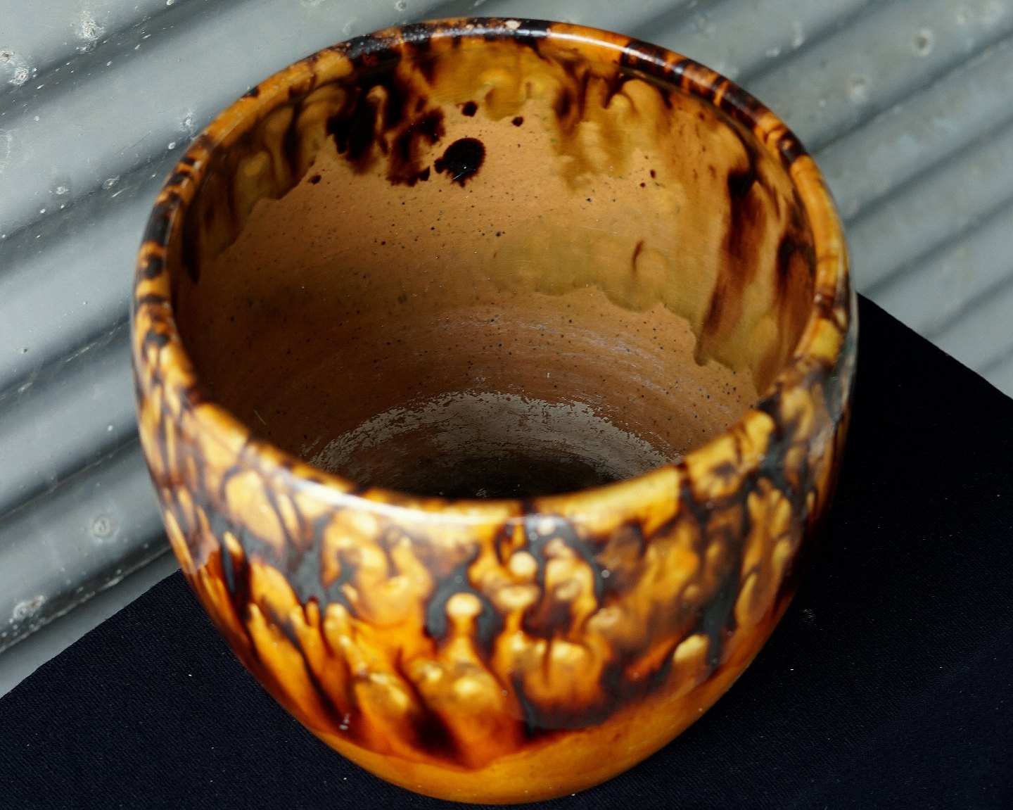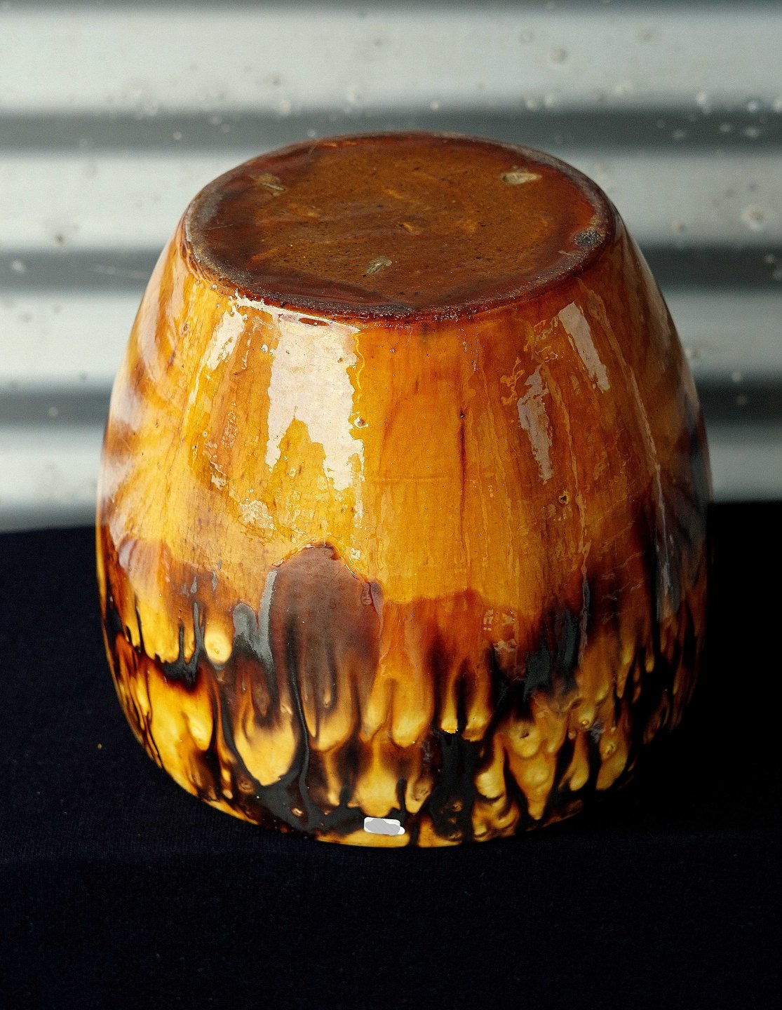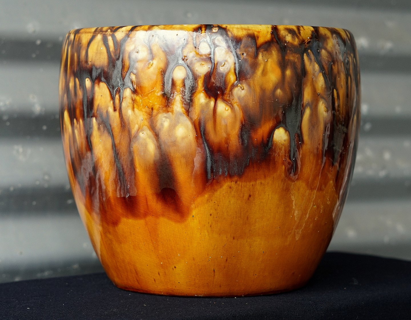 Stor gulv urtepotte med gyldent og brunt glasur