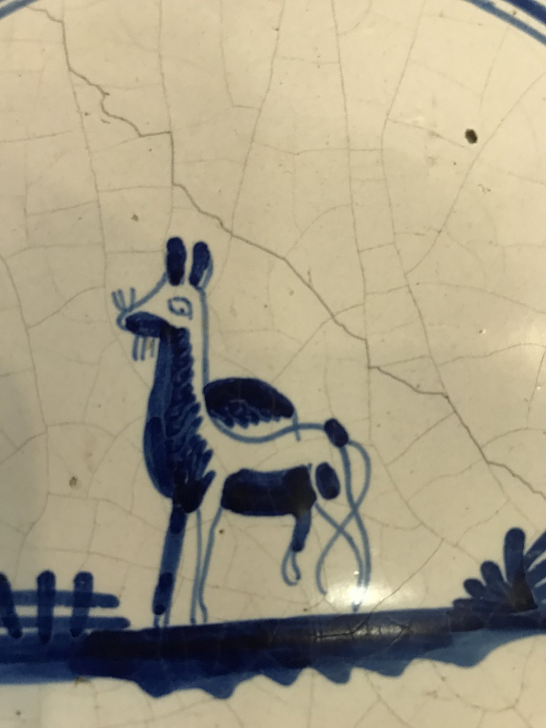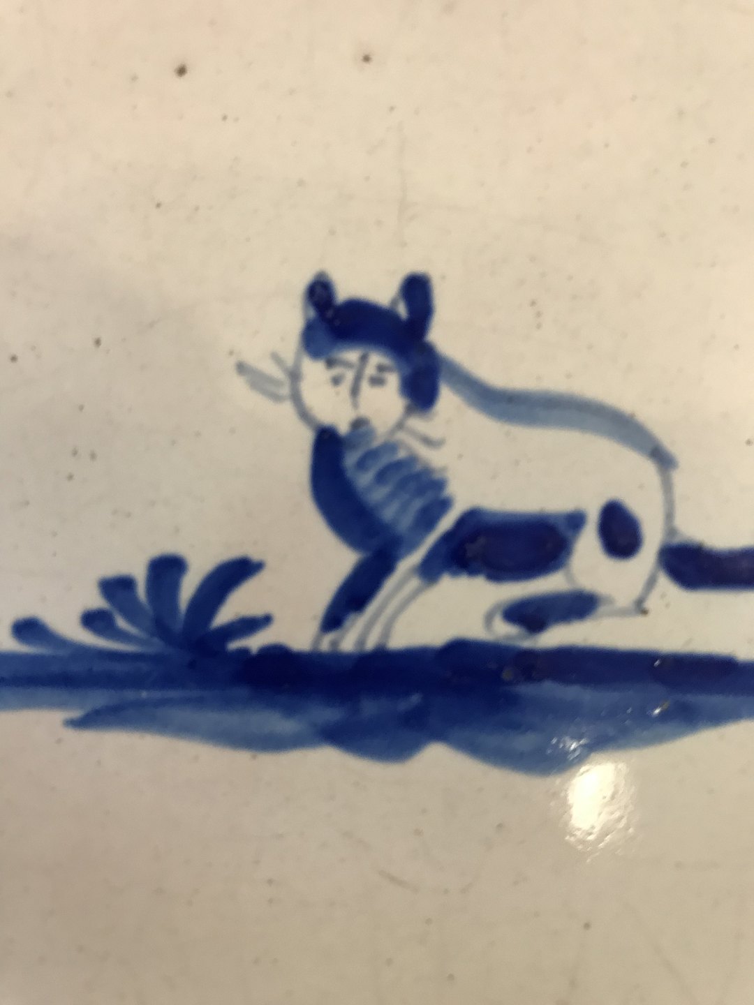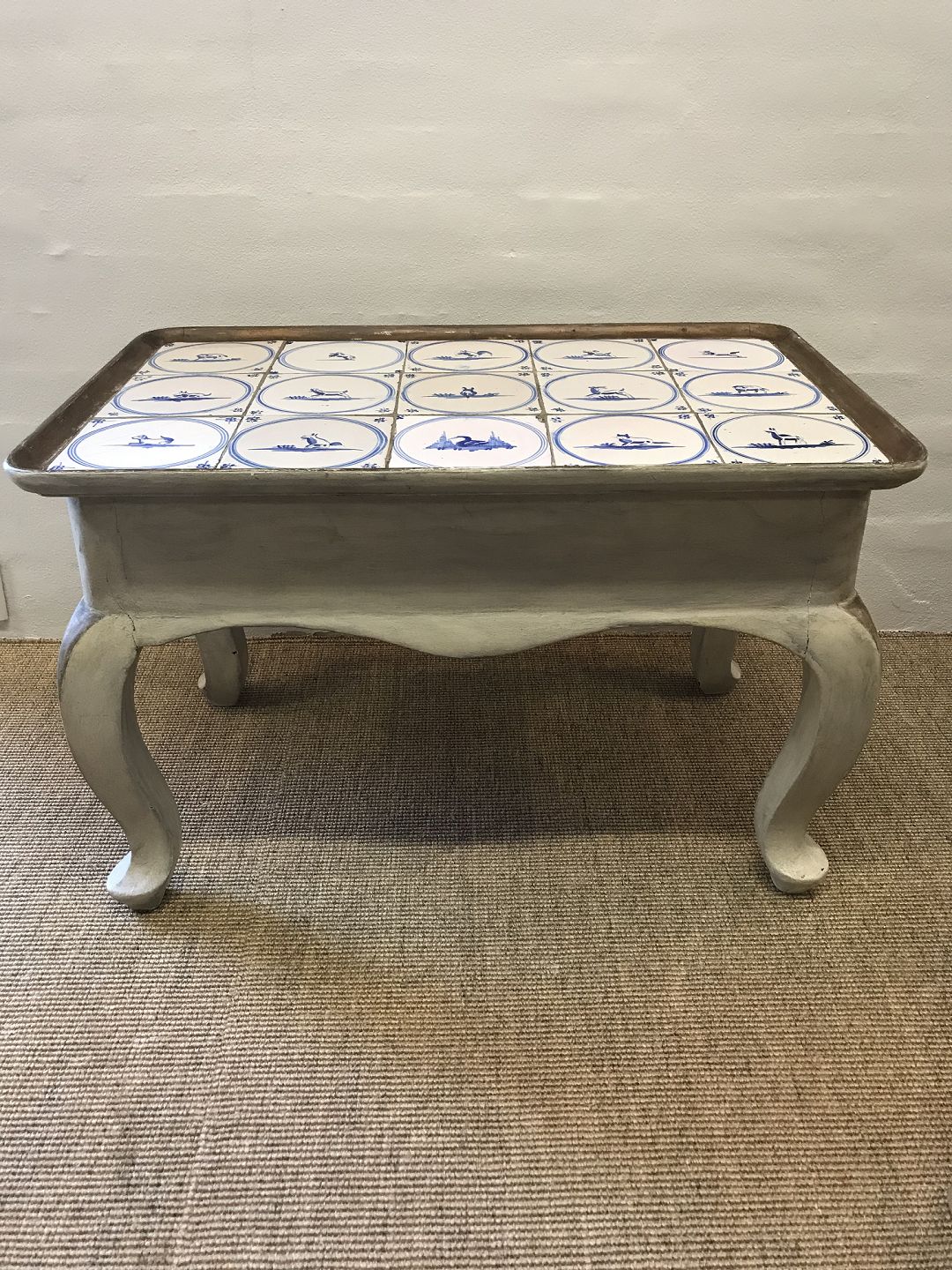 Flisebord. Måske til brug ved kamin. 1700 tals fliser med dyr. Bordet senere. 15 fliser. Mål 70x44 h 46 cm.