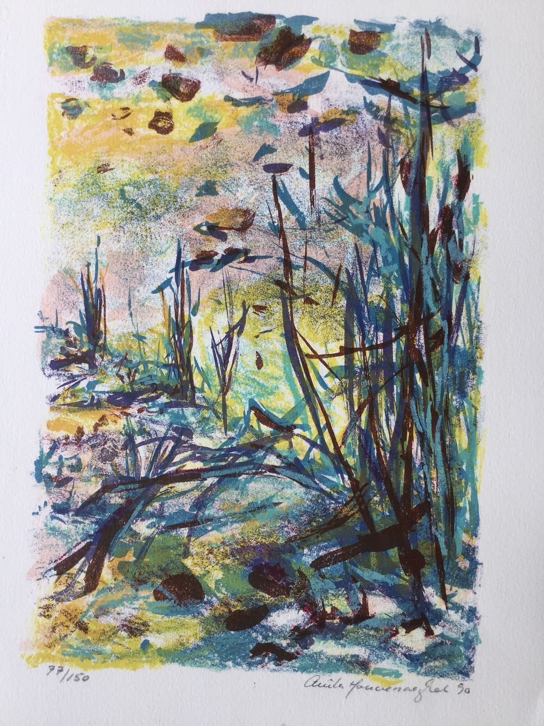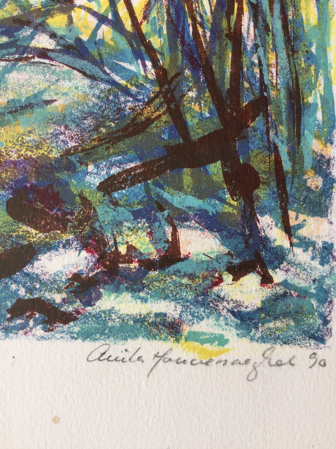 Farvelitografi af Anita Houvenaeghel - Landskab 1990
