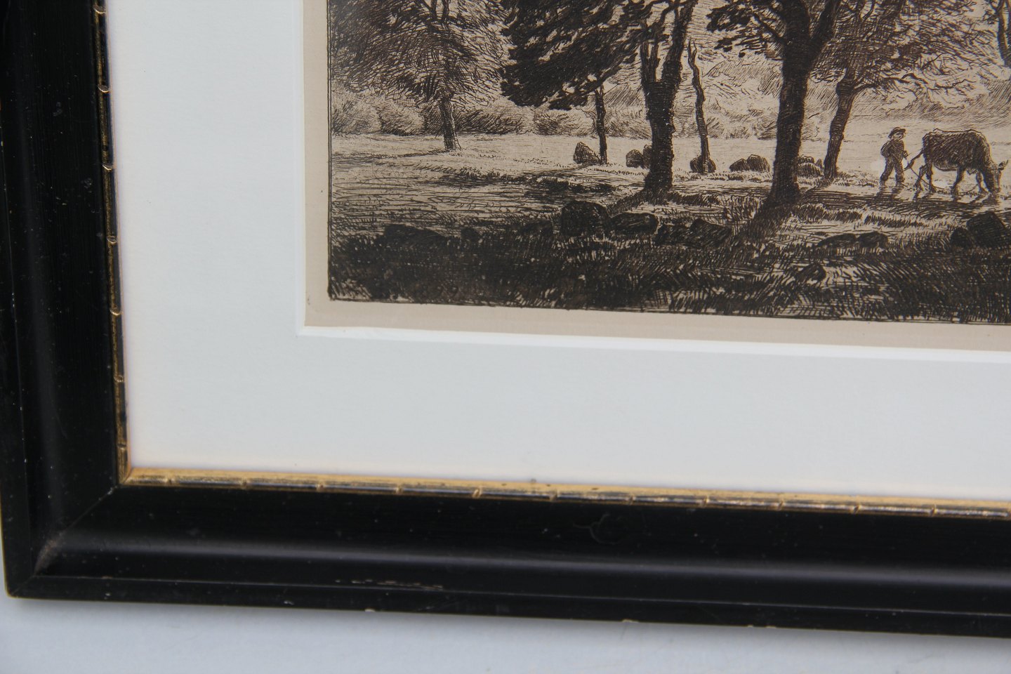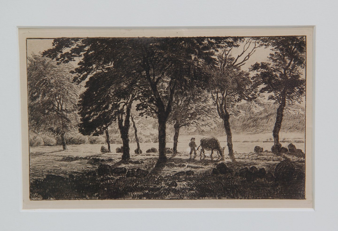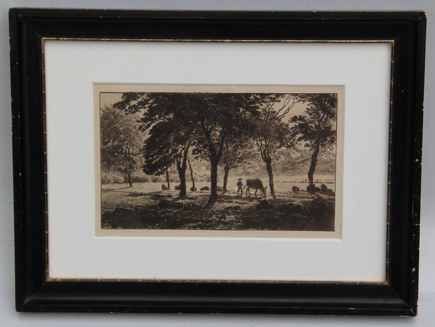 Radering Skovgaard 1899 Røgterdreng med ko i skov 25.5 x 33.7 cm i træramme