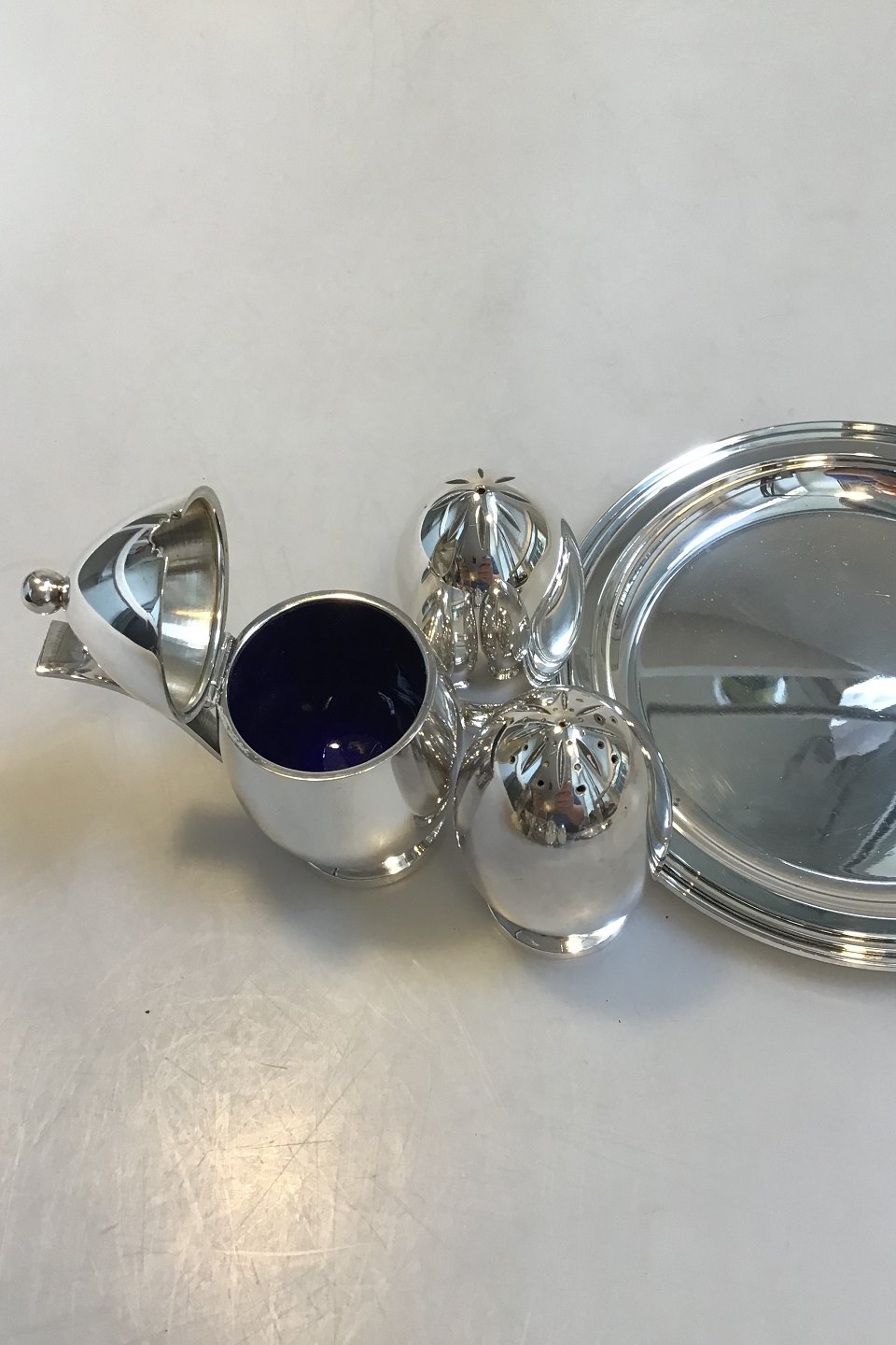 A. F. Rasmussen Sølv/Sterling Sølv Plat-de-menage Måler: H Salt 7 cm og Peber 6.5 cm, Sennepskrukke 8.6 cm med blå emalje.(Små afslag) Bakken Diam 13.5 cm