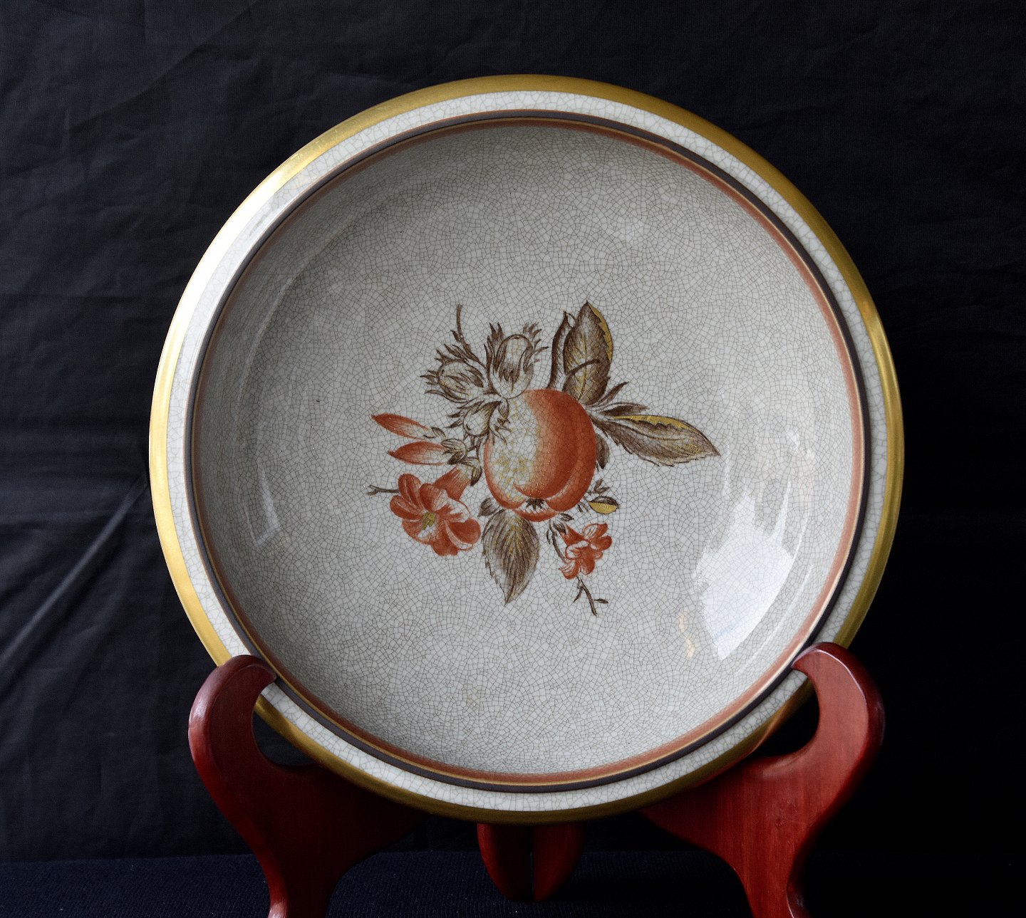 Royal Copenhagen krakele fad 706/3606, der er guldkant på fadet og fadet er dekoreret med frugt og blomster i brændte farver