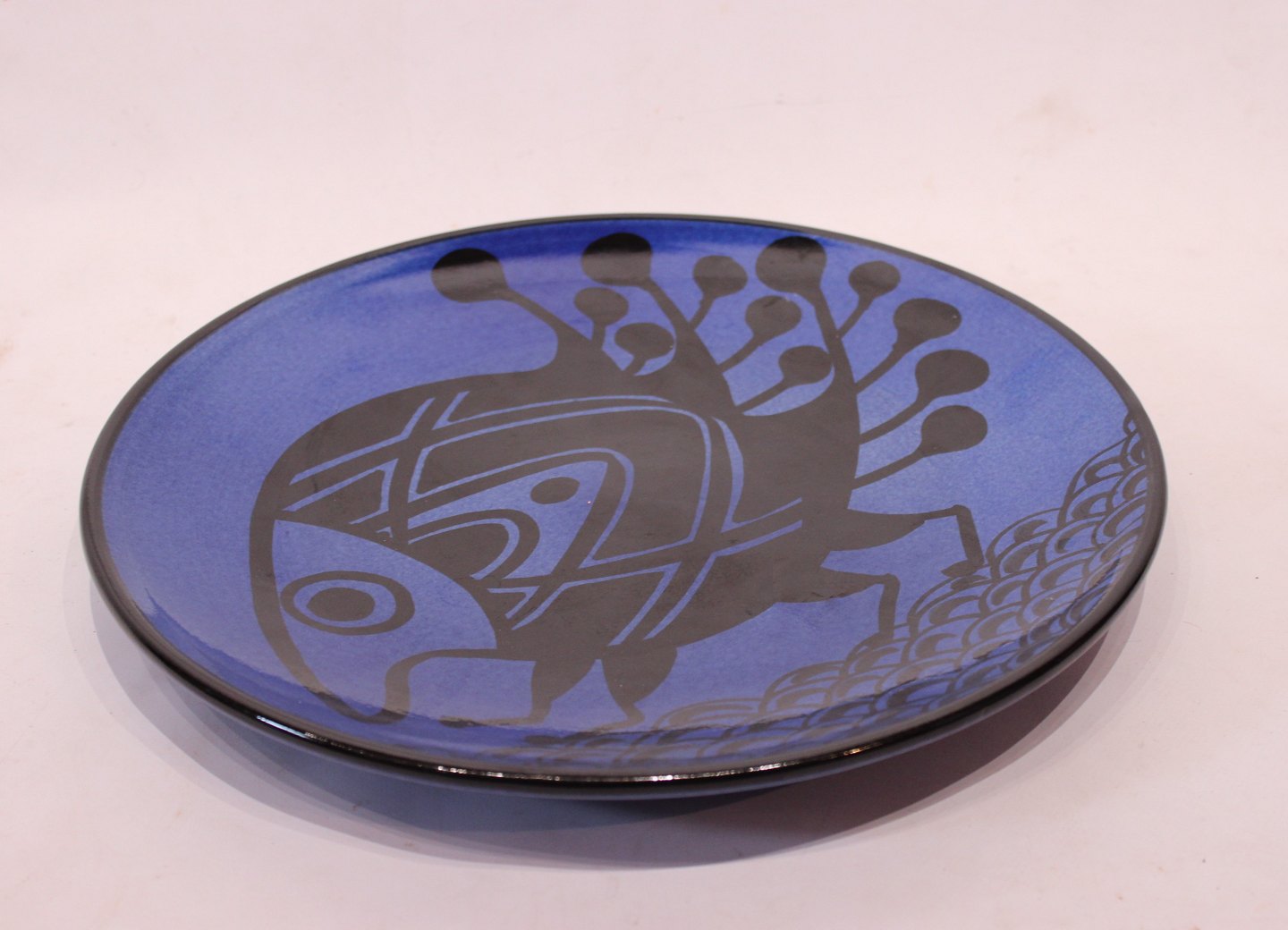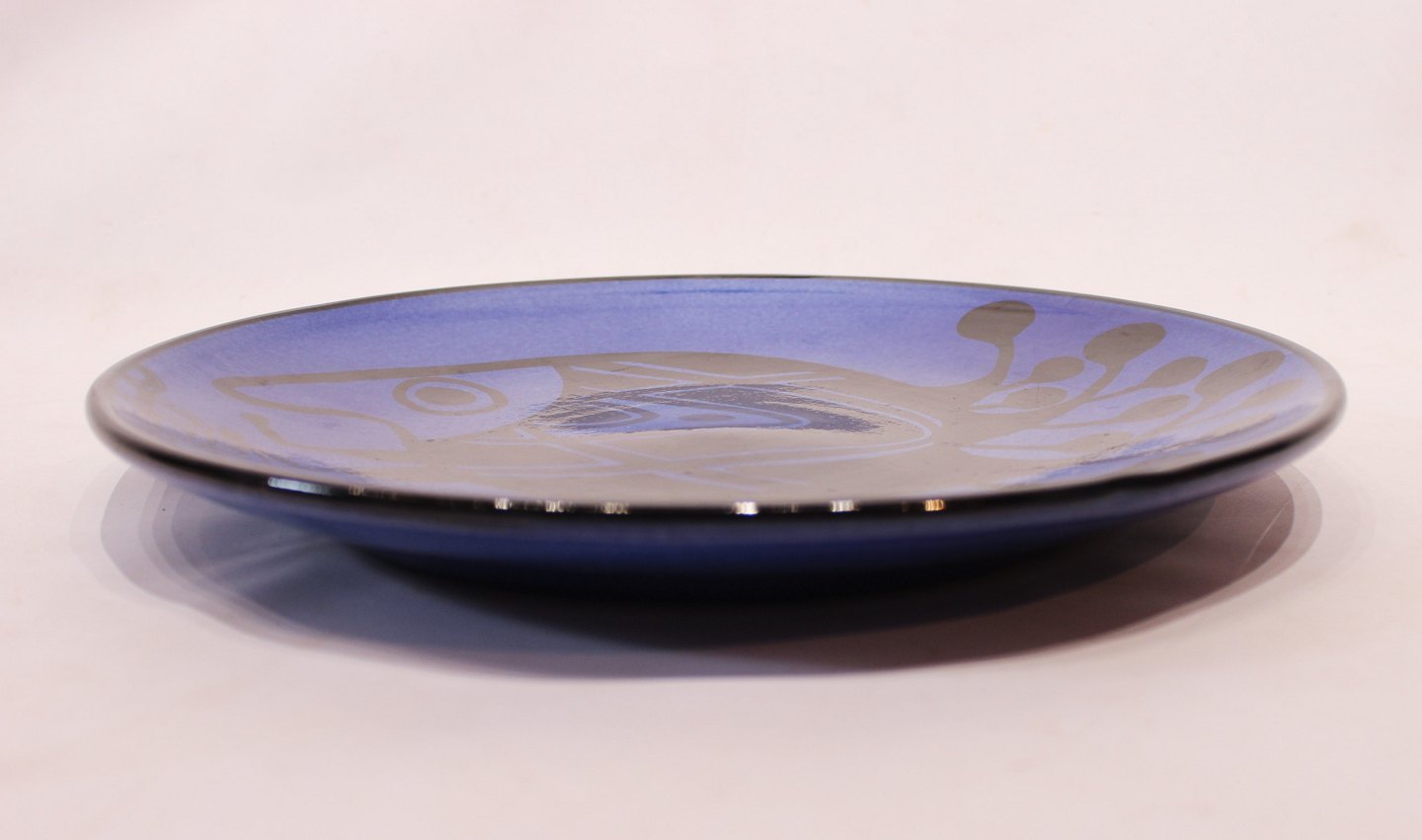 Large round ceramic dish with dark blue glaze and motif of a fish, by Pottemagerstuen at Graabrødretorv 1.