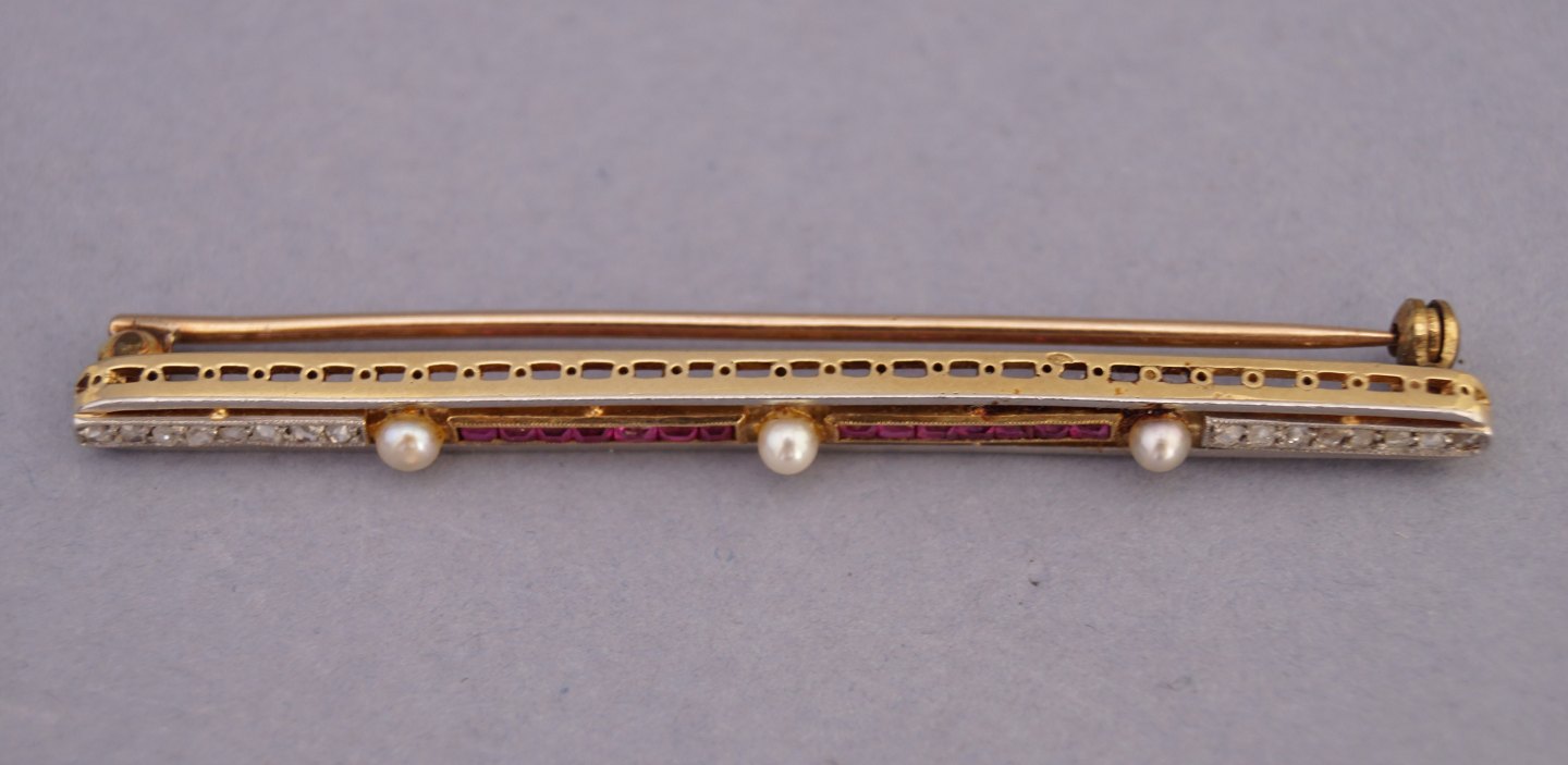 A brooch in 14k gold and white gold set with diamonds, rubies and perls