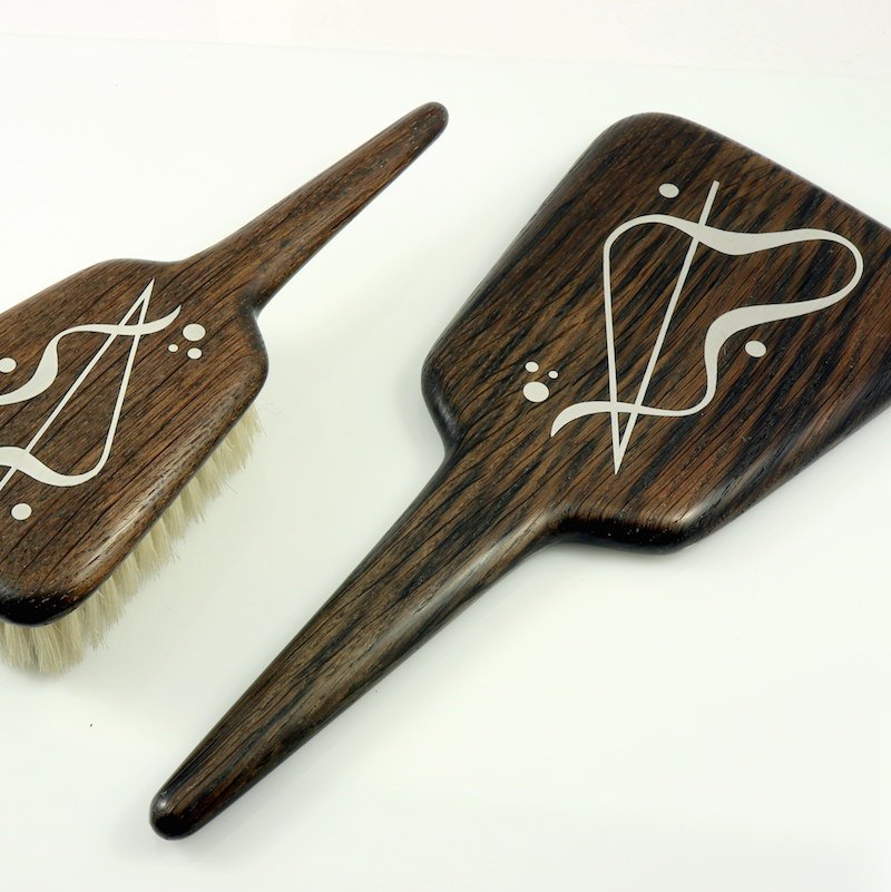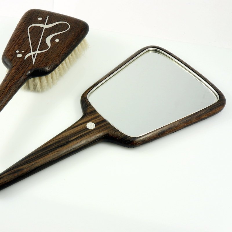 Toiletgarniture i moseeg med sterling sølv intarsia. 1960erne
