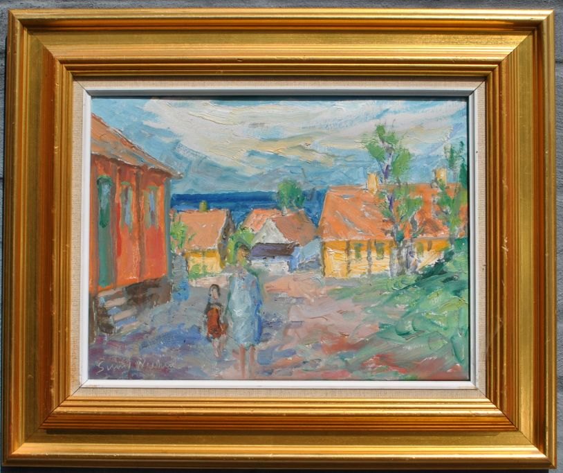 Nielsen, Svend (1908 - 1993) Danmark: En kvinde og et barn på en vej, Bornholm. Olie på lærred. Signeret.: Svend Nielsen. 30 x 40 cm.