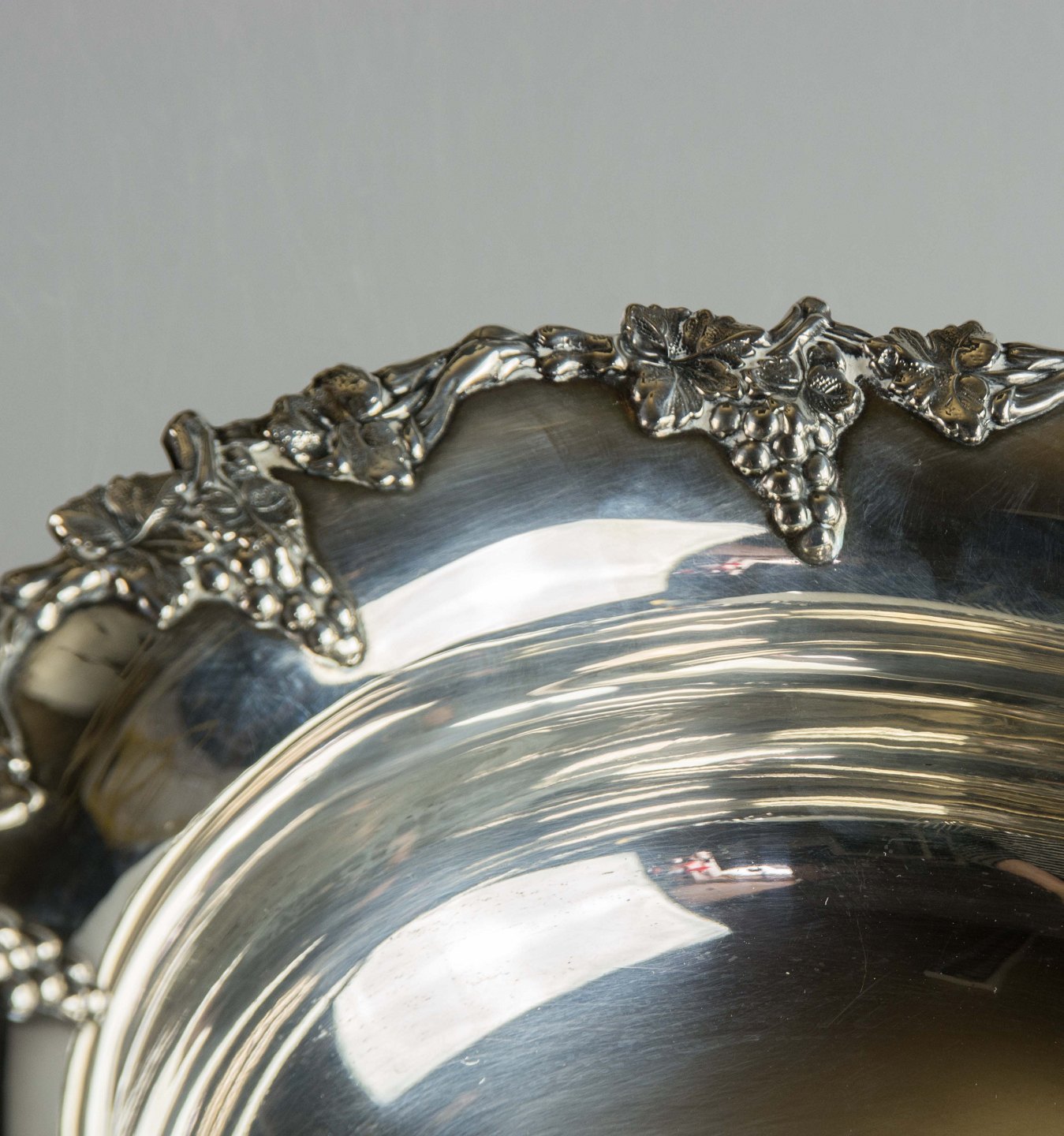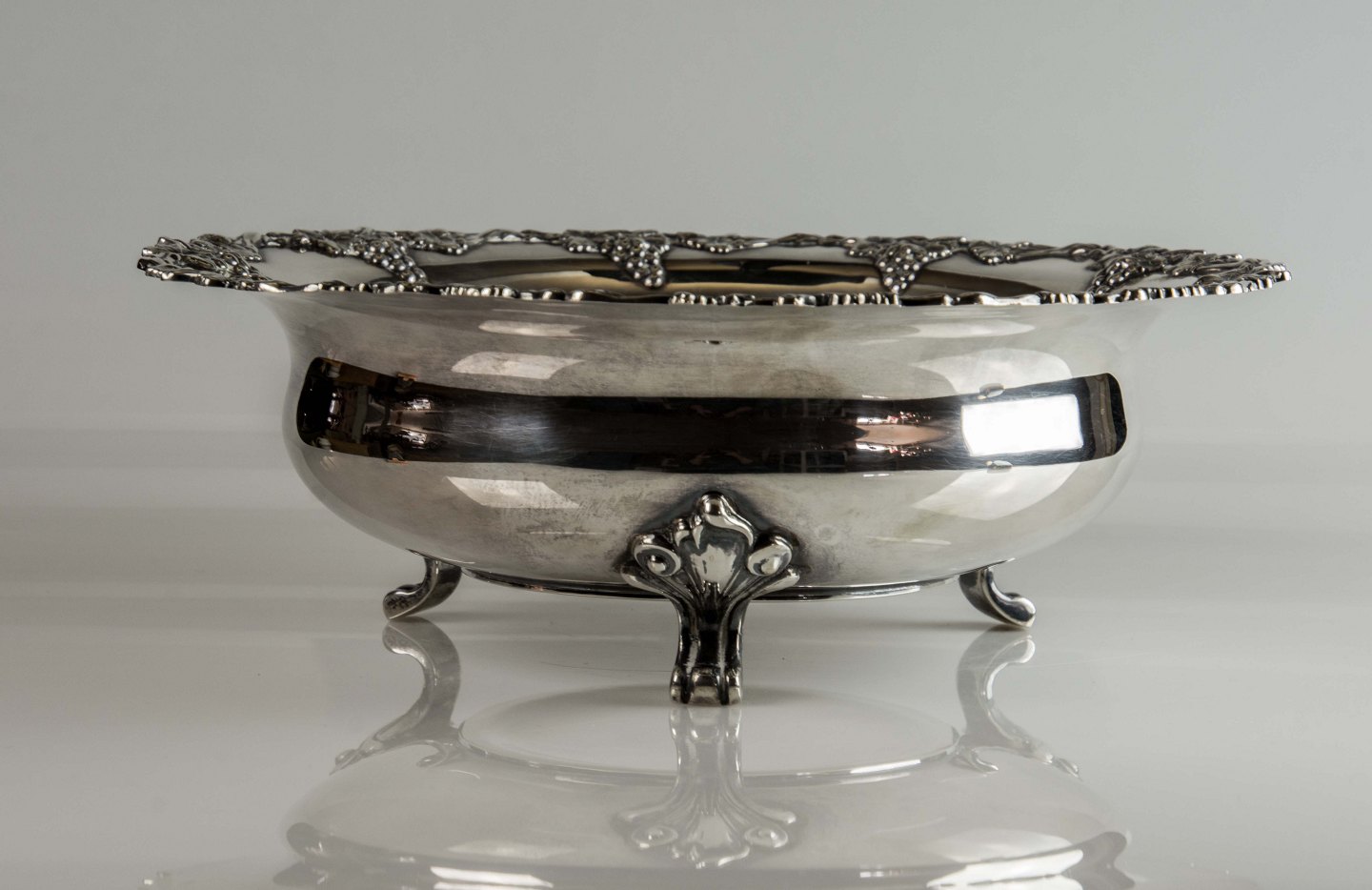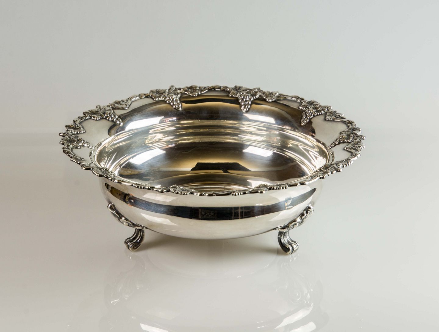 Stor skål på fod i tretårnet sølv med dekoration af vindrueranker