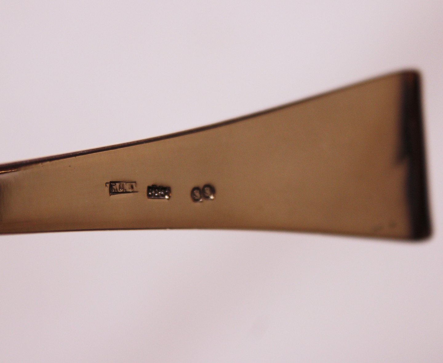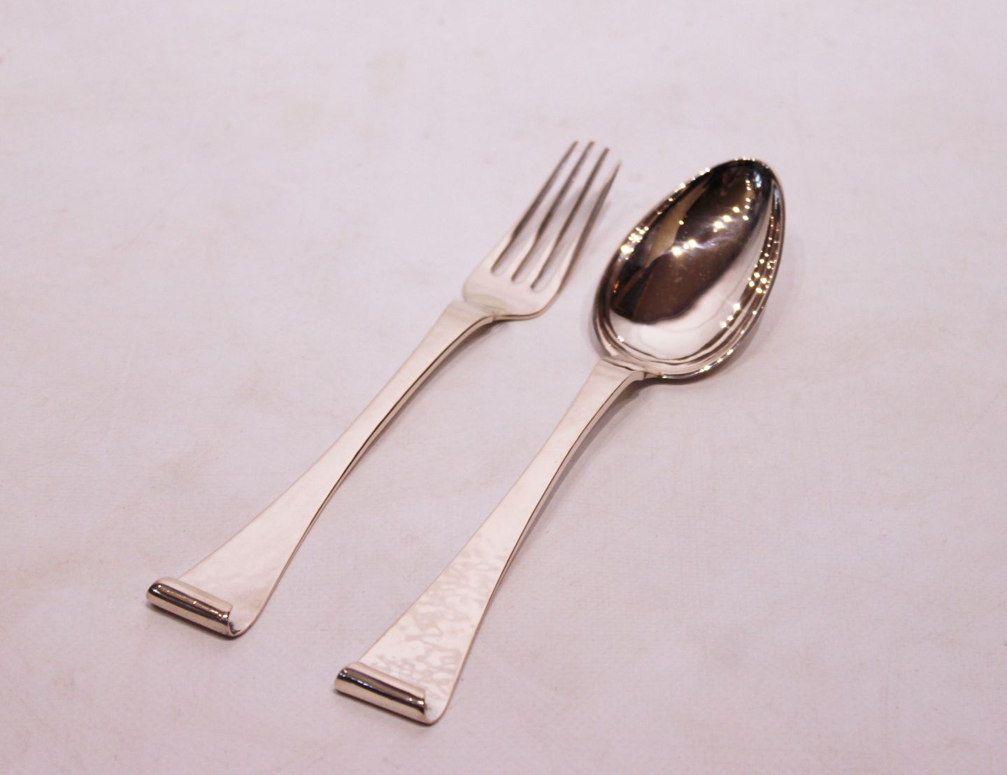 Middagsgaffel og middagsske i andet mønster af sølv.