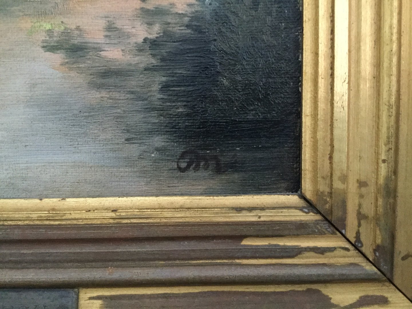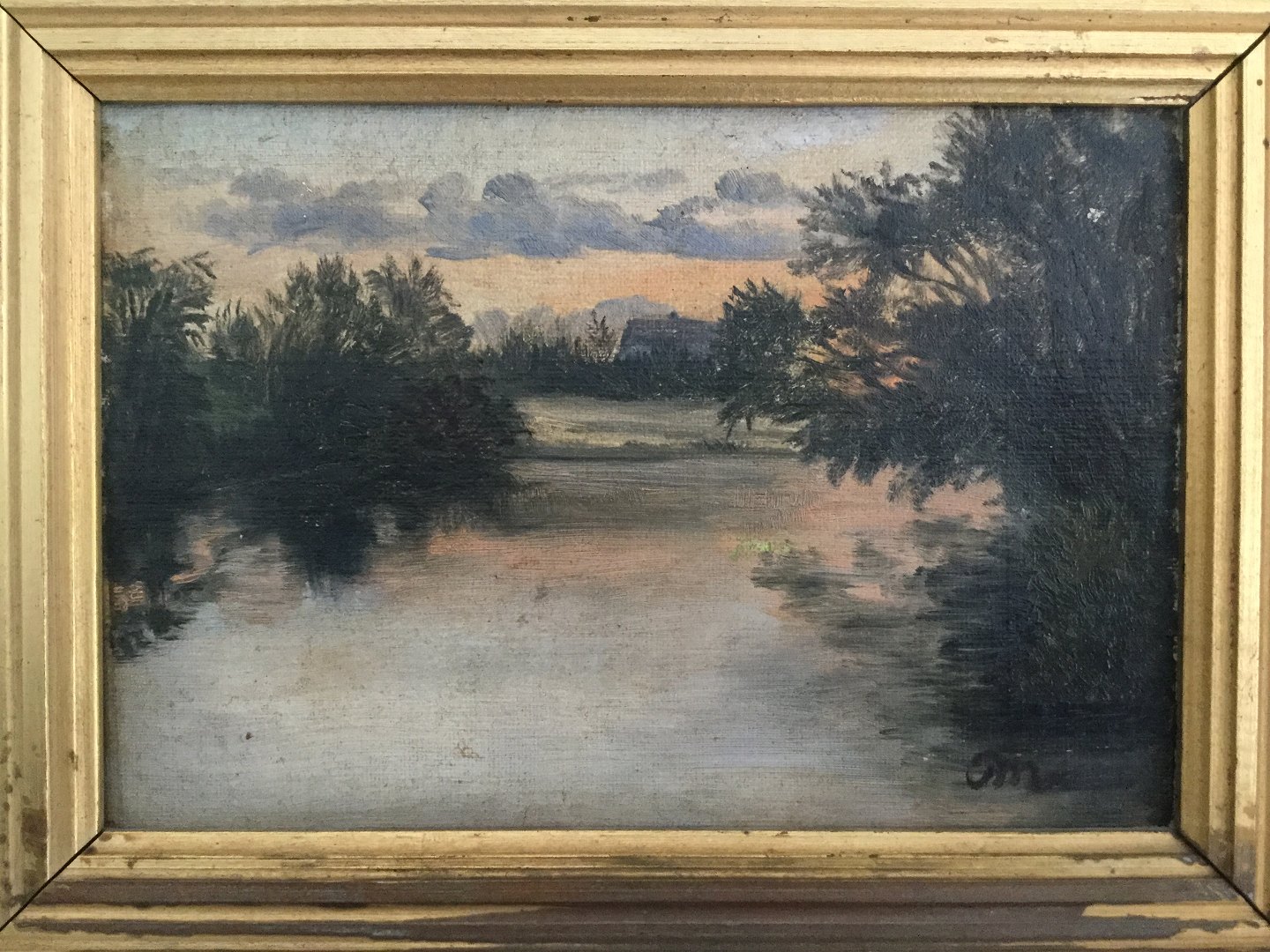 Bagpå "Ved en skovsø" samt auktions- og udstillings- numre/mærkater.
