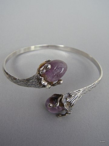 Slangeformet Sølvarmring 925 sterling med stene/ Ametyst? D: 6,7 cm.