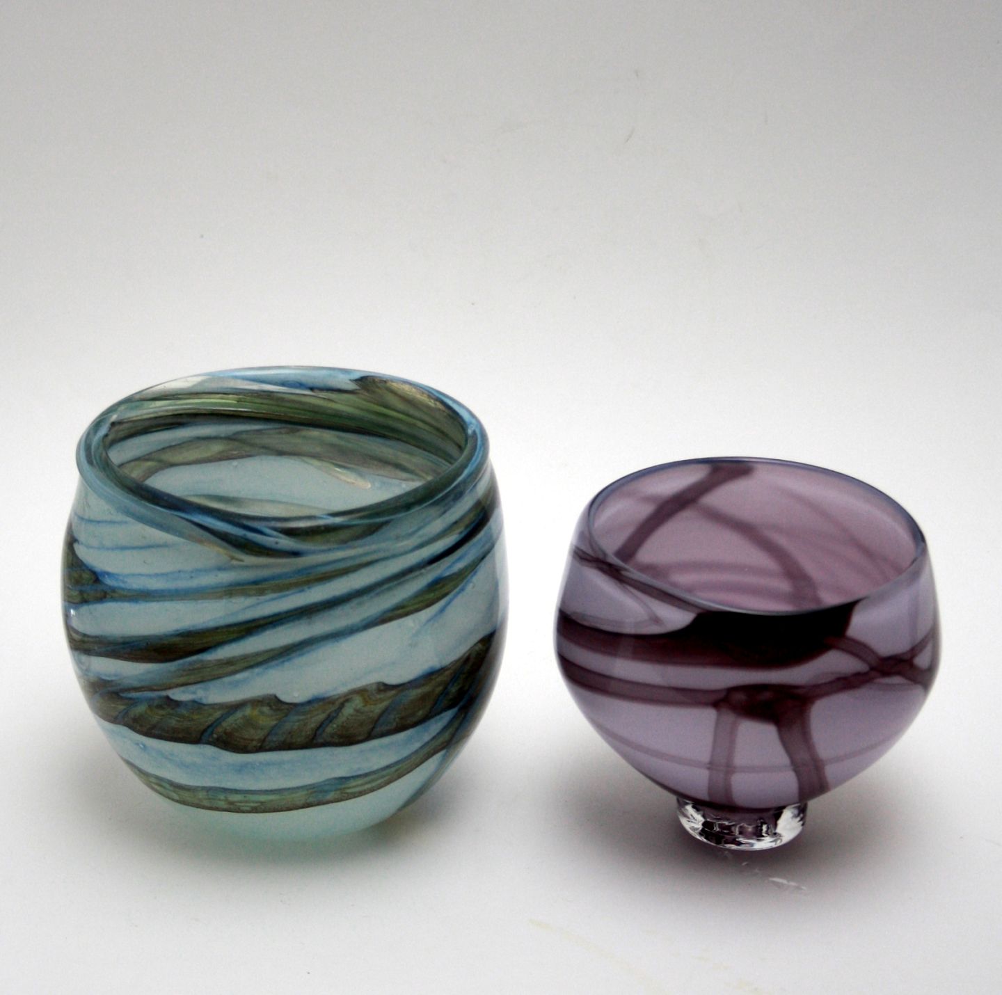 Tv. Skål i blå og grønne nuancer/striber. Utydelig signatur. Højde 12 cm. Øverste diameter 12 cm. Pris: 300 kr.