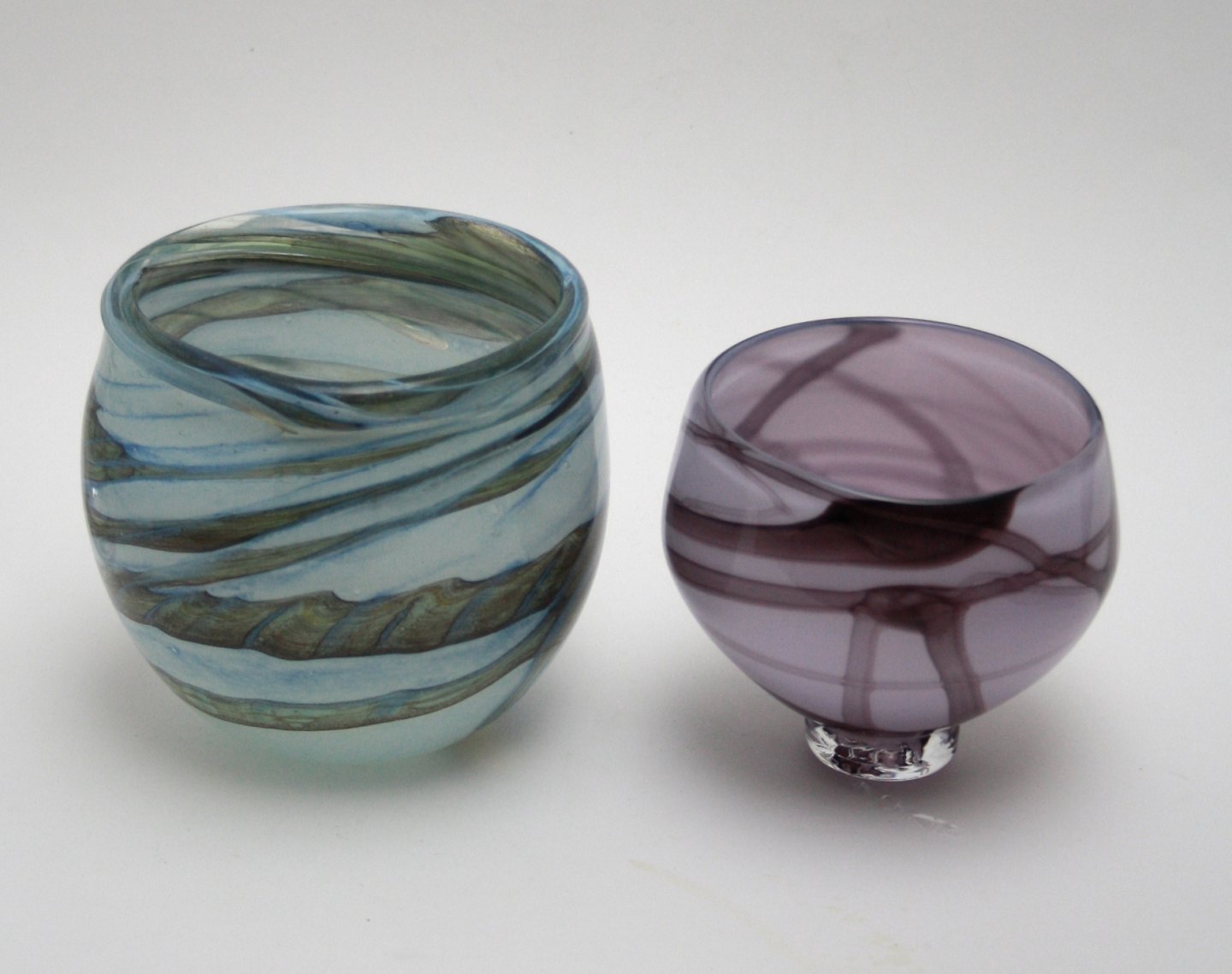 Text available in Danish: Tv. Skål i blå og grønne nuancer/striber. Utydelig signatur. Højde 12 cm. Øverste diameter 12 cm. Pris: 300 kr.