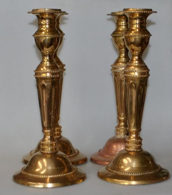 4 ens messingstager, 19. årh. Fodstykke med perlestaf. Stamme med kannelleringer. Højde: 32 cm.