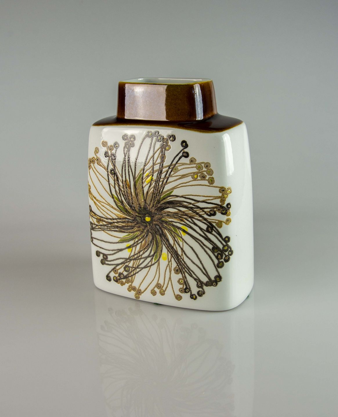 Vasen er i lys fajance med brun topkant og mønster i brungyldne nuancer.