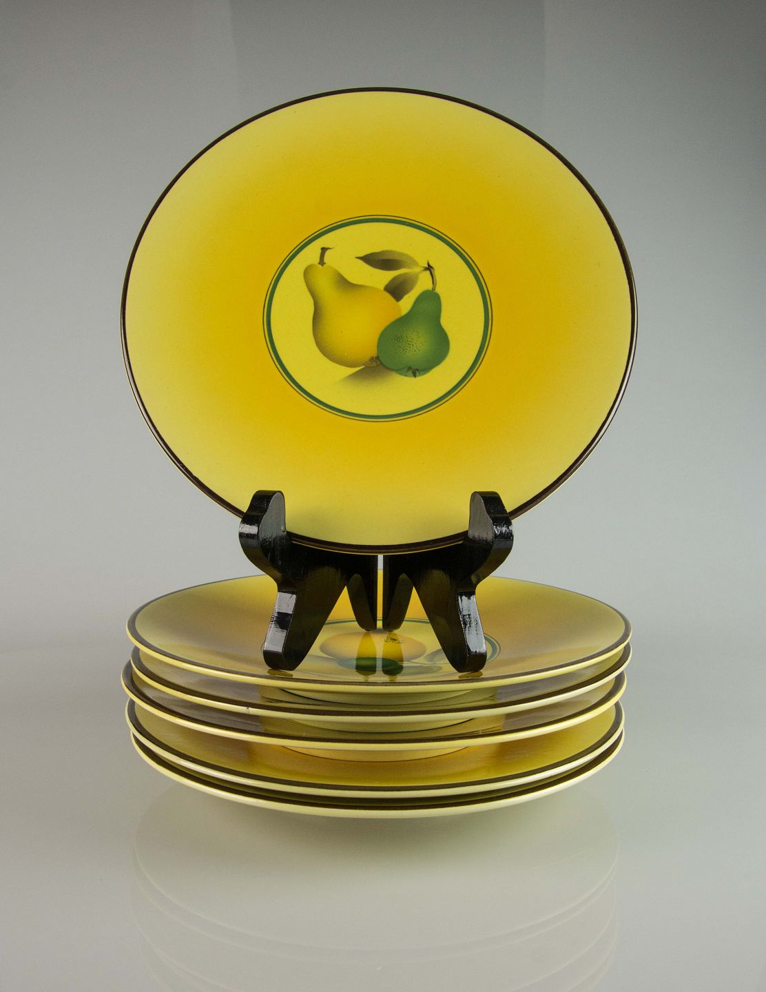 Sættet består af 5 tallerkner i kunstfajance med forskellige frugt motiver på gul baggrund.