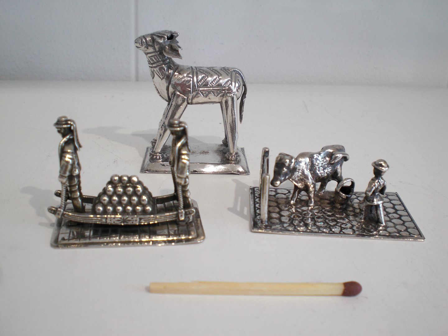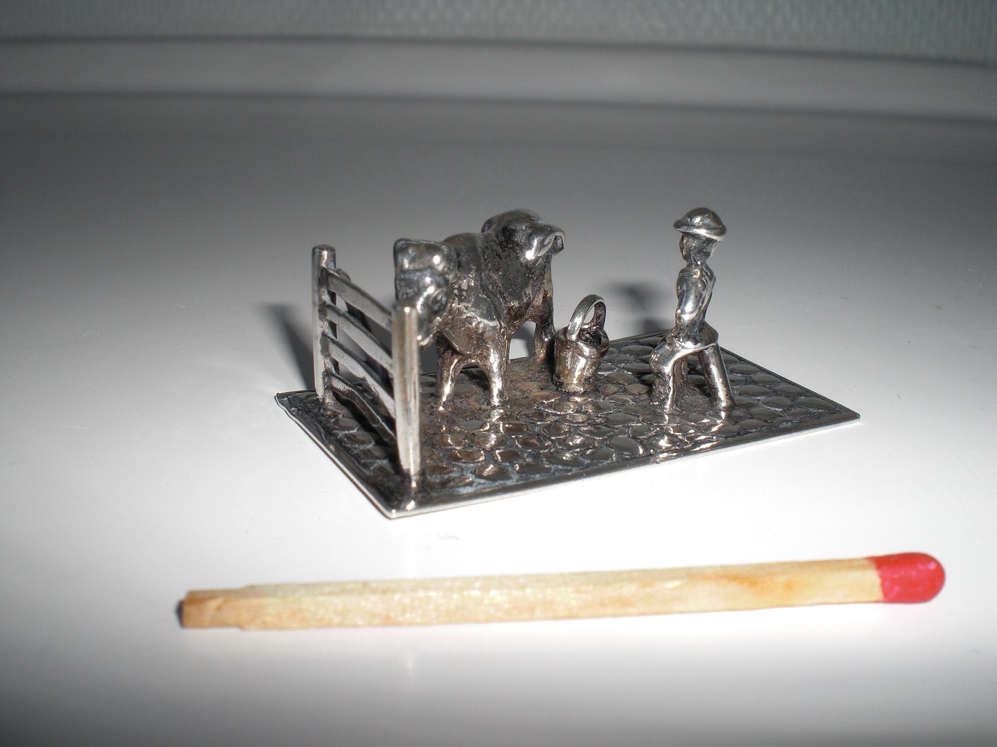 Figurer til højre:Miniaturefigur ustemplet sølv?, ca. 1900. Mand der skal til at malke en ko, siddende på en skammel ved siden af mælkespand. Koen står ved et hegn. Mål: 4,9 x 3 x 1,8 cm. Vægt: 25,5 gram. I fin stand. Solgt.