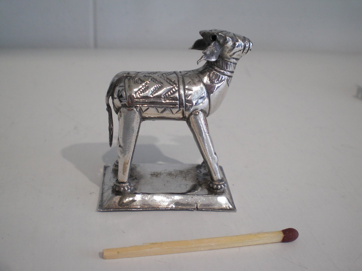 Indien ca. 1900. Hjorten er ciseleret med mønstre. Der har nok været horn på den engang: 4 x 2,3 x 4,5 cm. Vægt: 13,6 gram. Horn mangler. Pris: 120 kr.