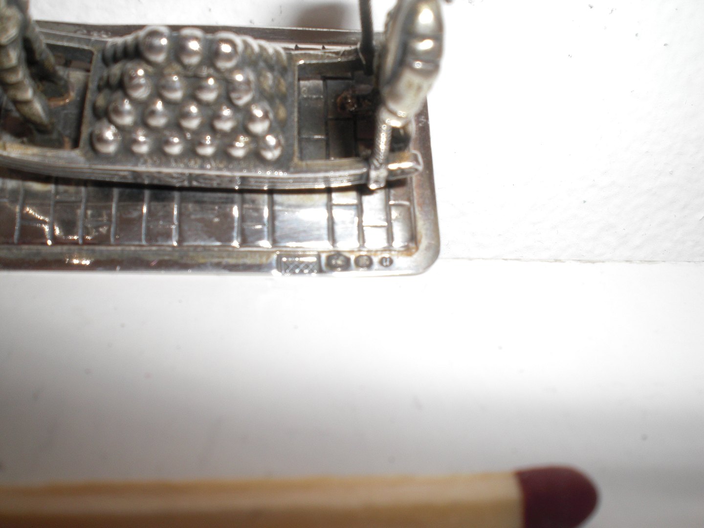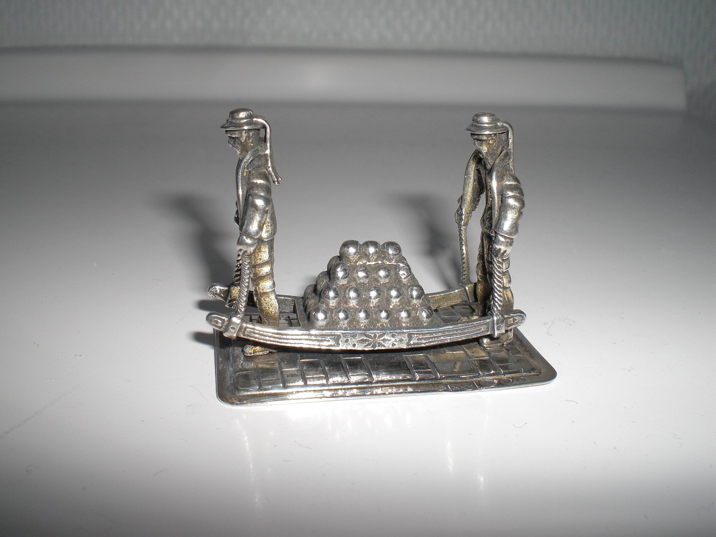 Til venstre: figurer i engelsk sølv. Stemplet i Exeter 1876. 2 matroser bærer en slæde med en stabel kanonkugler. Mål: 4 x 2,4 x 3 cm. Vægt: 19,7 gram. I fin stand. Solgt.