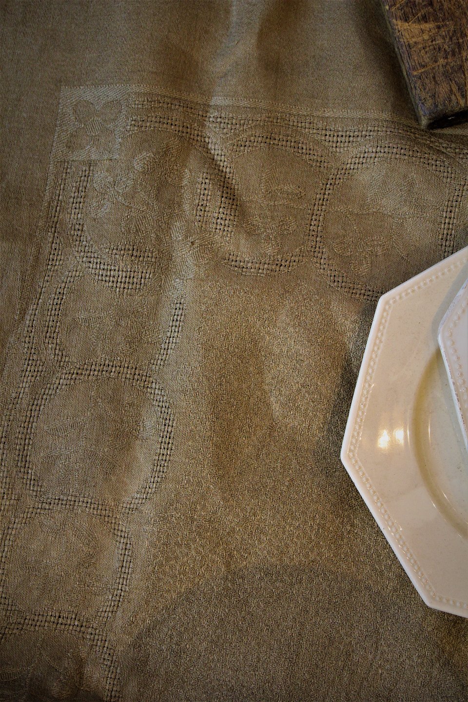 Beautiful old French damask woven linen tablecloth in super fine quality in fine ocher / brass color. Measures 230x160cm.