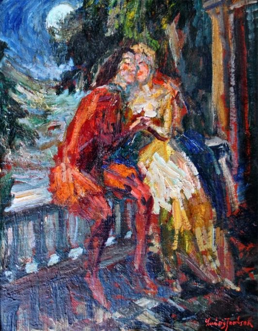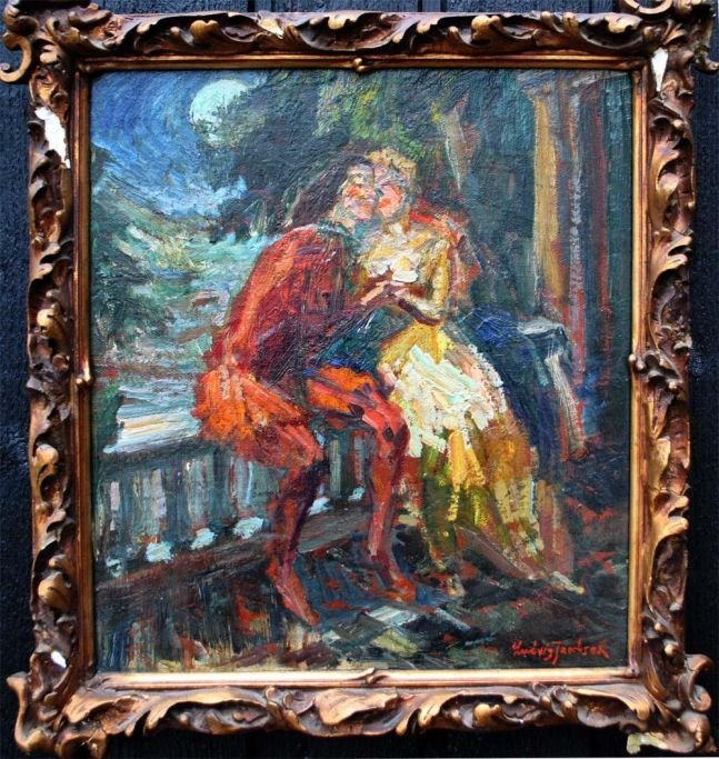 Jacobsen, Ludvig (1890 - 1957) Danmark. "Romeo og Julie". Olie på lærred. Signeret. 38 x 33 cm.