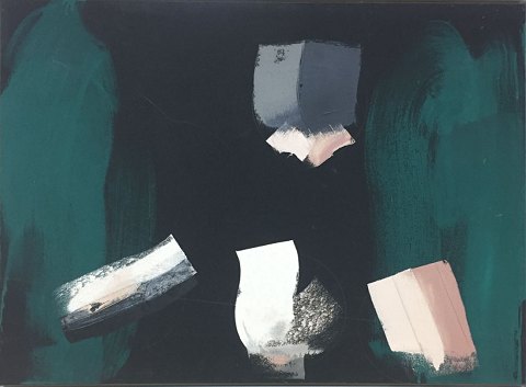 "Komposition" Olie maleri på lærred, i flot sølv ramme.