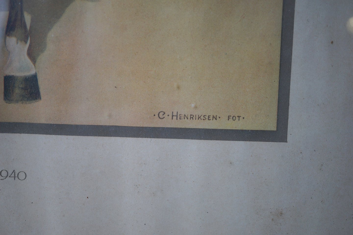Indrammmet tryk i trærammen med motiv af Kong Christian den tiende til hest med teksten 26. september 1870 - 1940