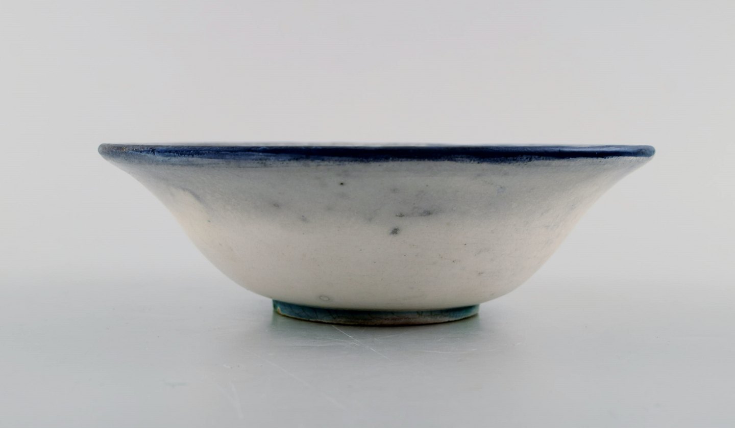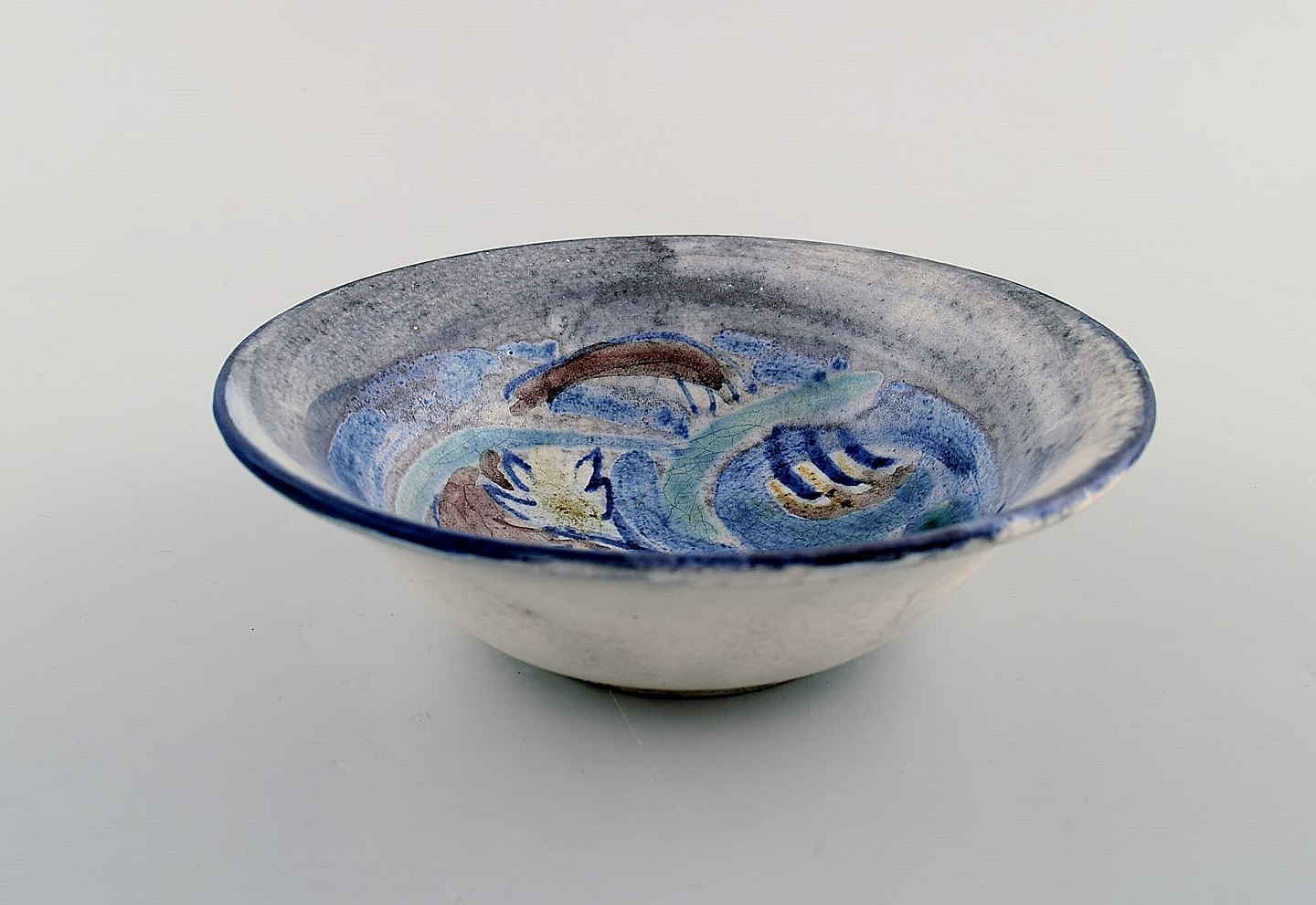 Julie Bloch Kyhn for Kähler, Denmark. Hand painted unique bowl in glazed ceramics with fish motif. Dated 1923.