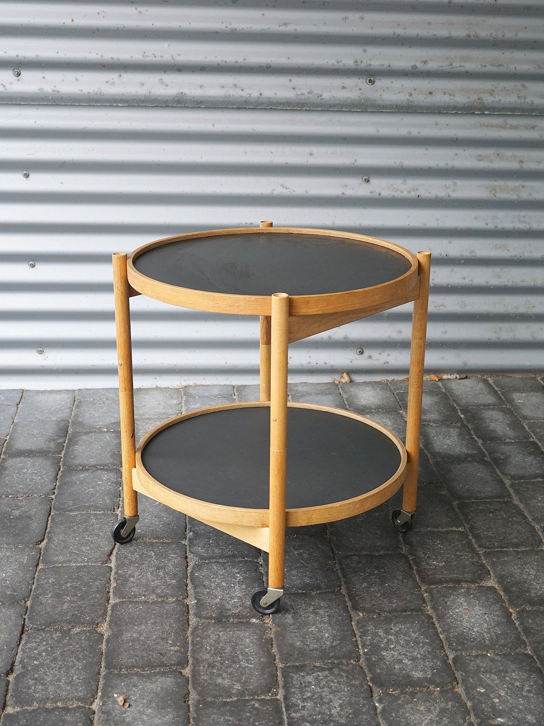 Bord på hjul med foldbart stel og vendbare bakker i sort og rødt laminat