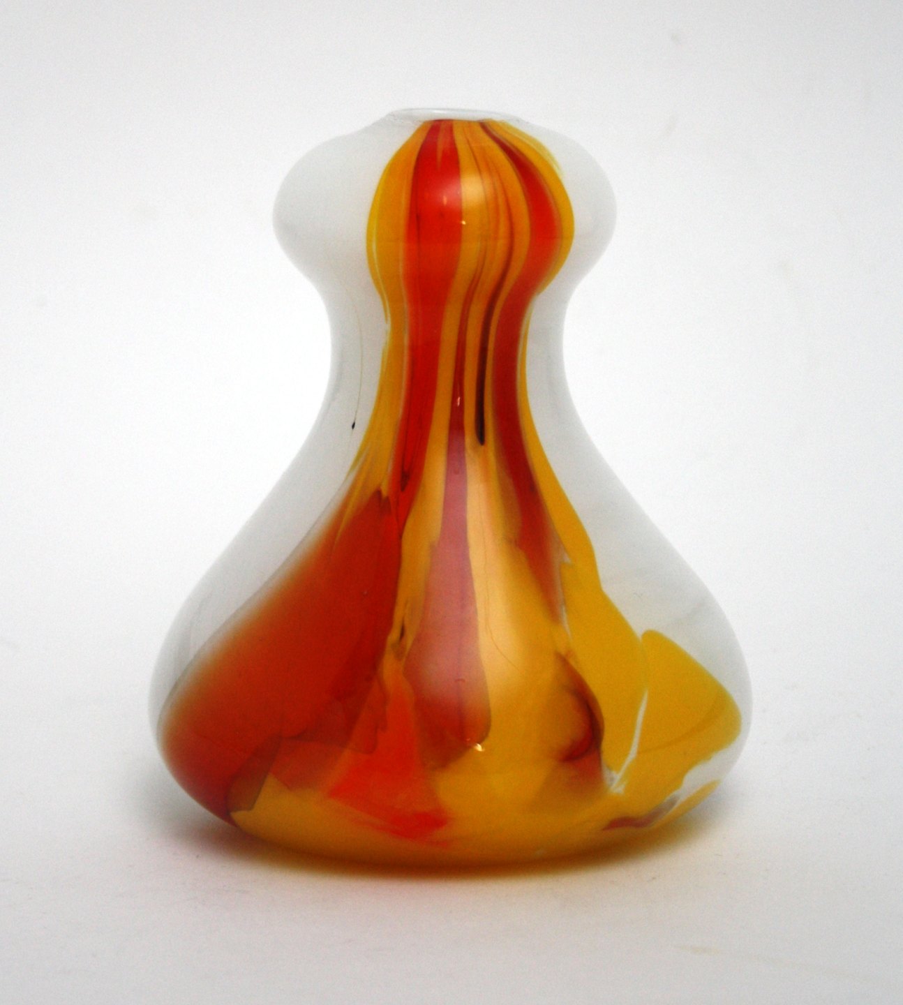 Holmegaard, Cascade vase designet af Per Lütken i 1975. Mundblæst opalhvid glas med indlagte skår i røde og orange farver. Signeret HG5 10842. Højde 13 cm. Diameter bund 11 cm. Sjælden. Pris: 575 kr.