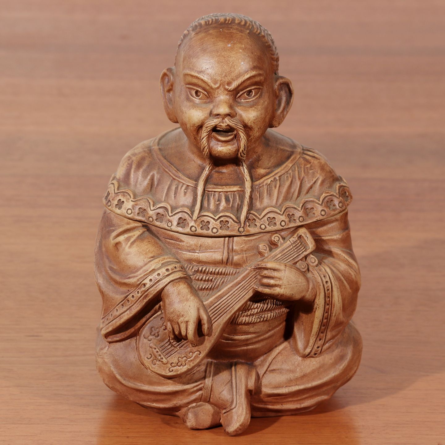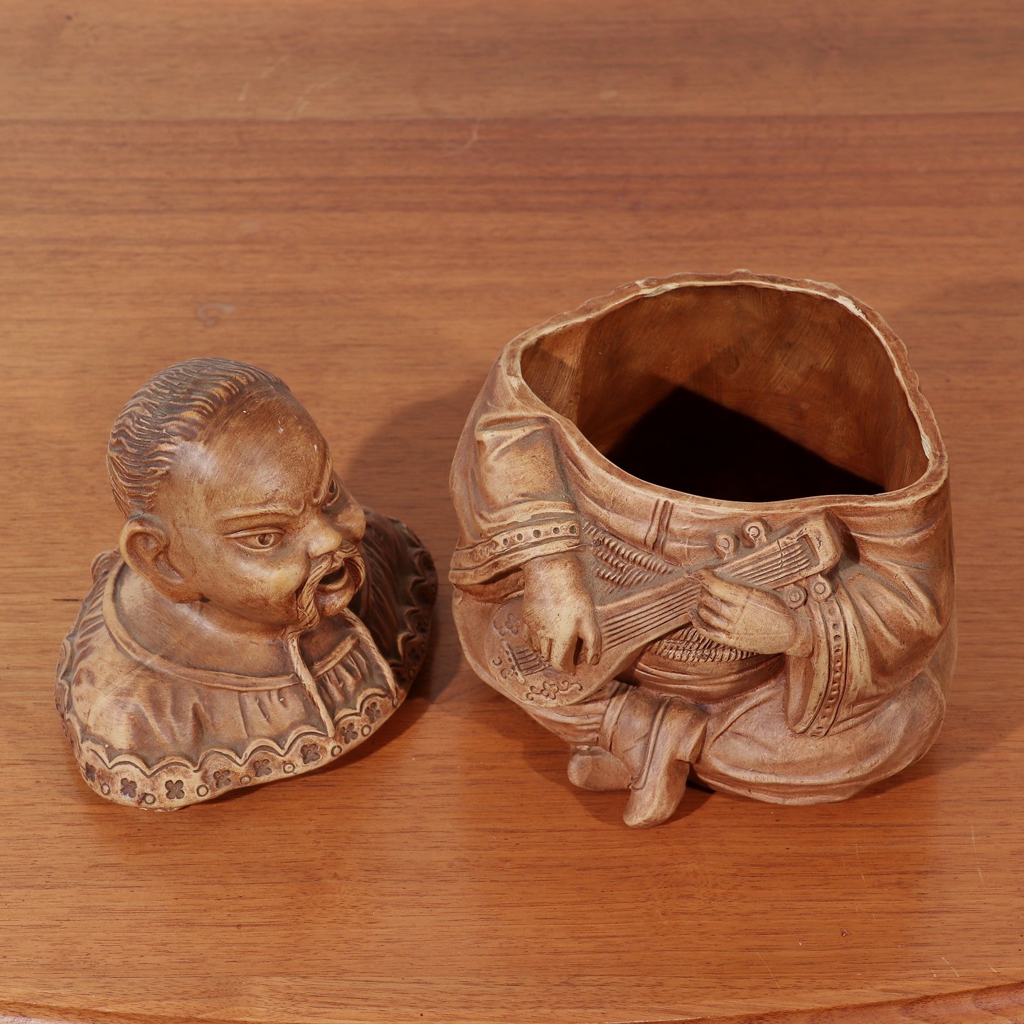 Lågkrukke i form af asiatisk figur i brændt lertøj med signatur i bunden.