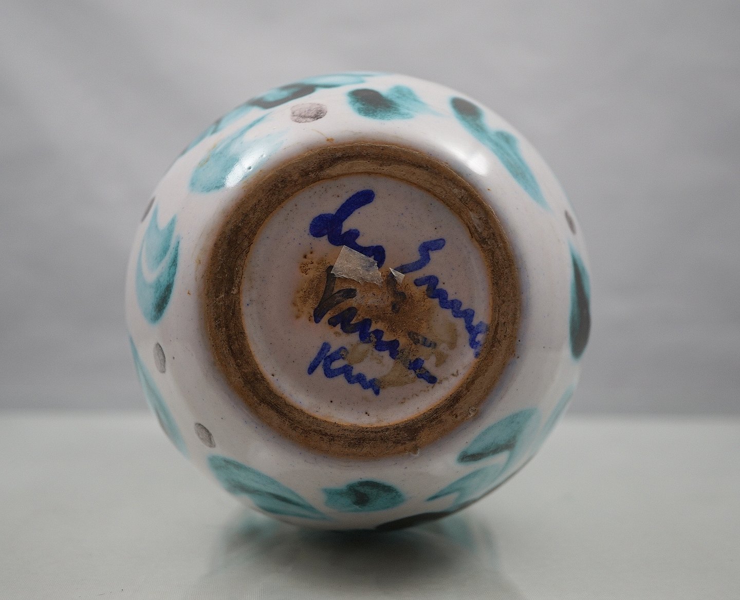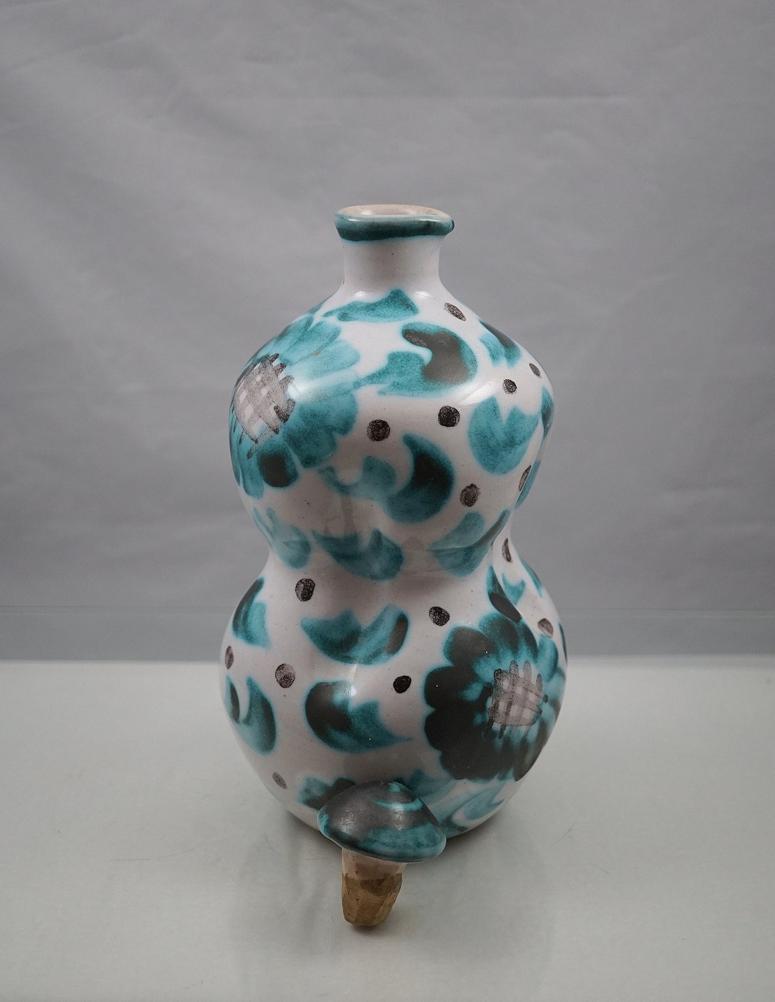Leo Emma, keramik klukflaske, hvid glaseret med grønligt mønster. Flasken har keramik prop