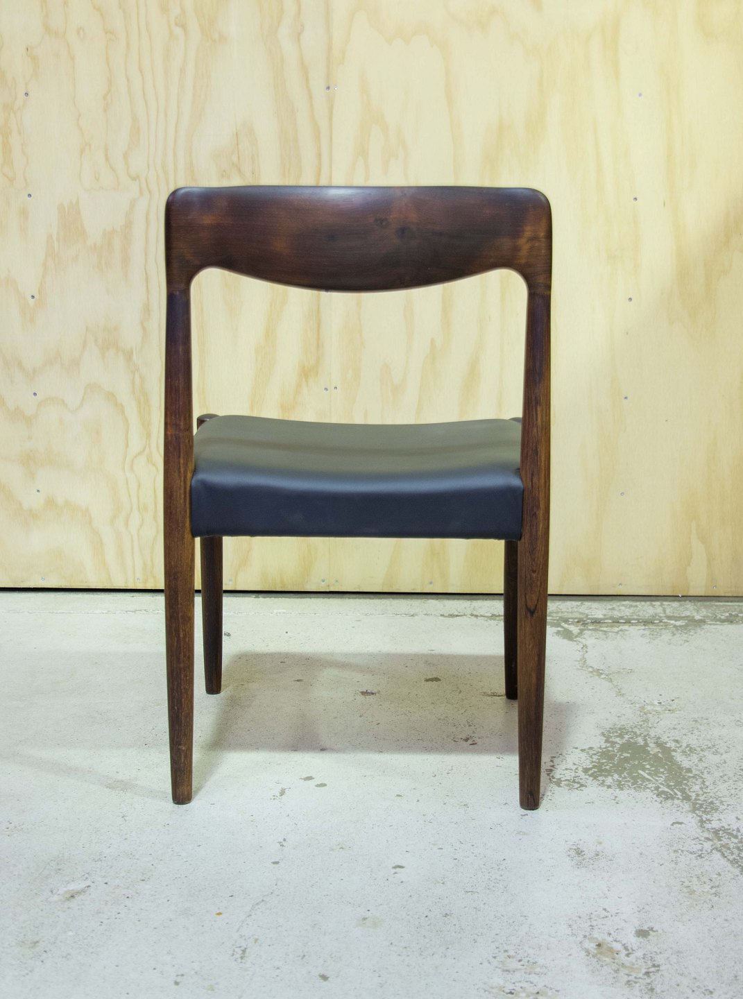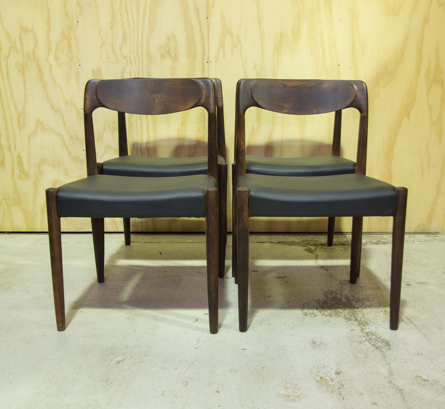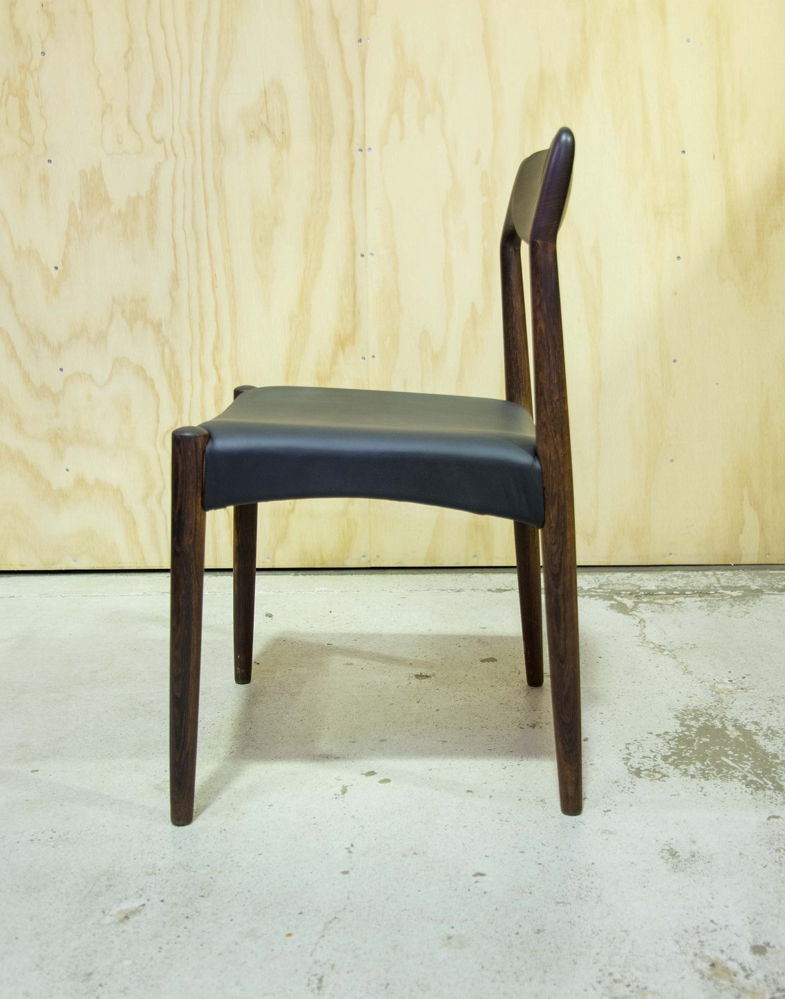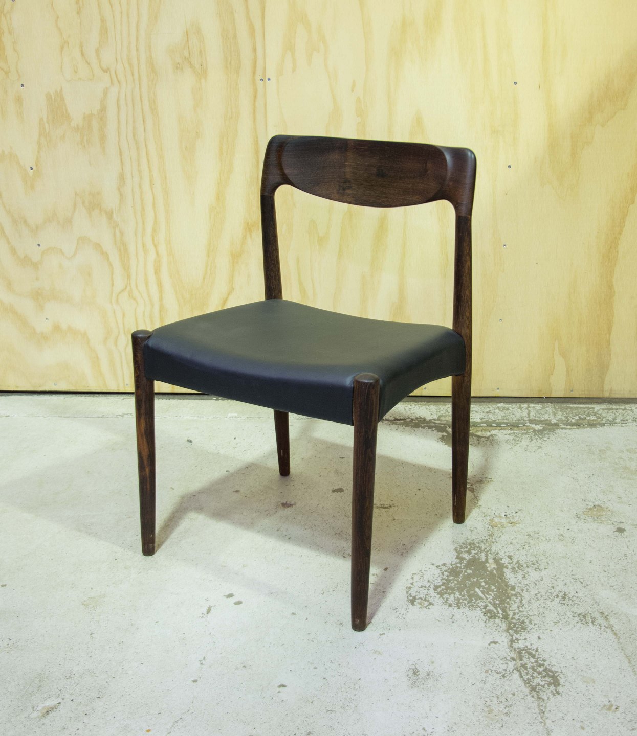 Et sæt unika stole i olieret palisander fra 1954 med lædersæder. Model 77/8