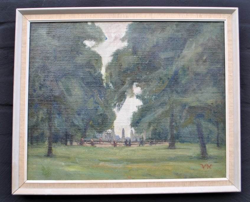 Henriques, Vilhelm (1894 - 1966) Danmark: Scene fra en park. Olie på lærred. Signeret: Monogram. 37 x 45 cm.