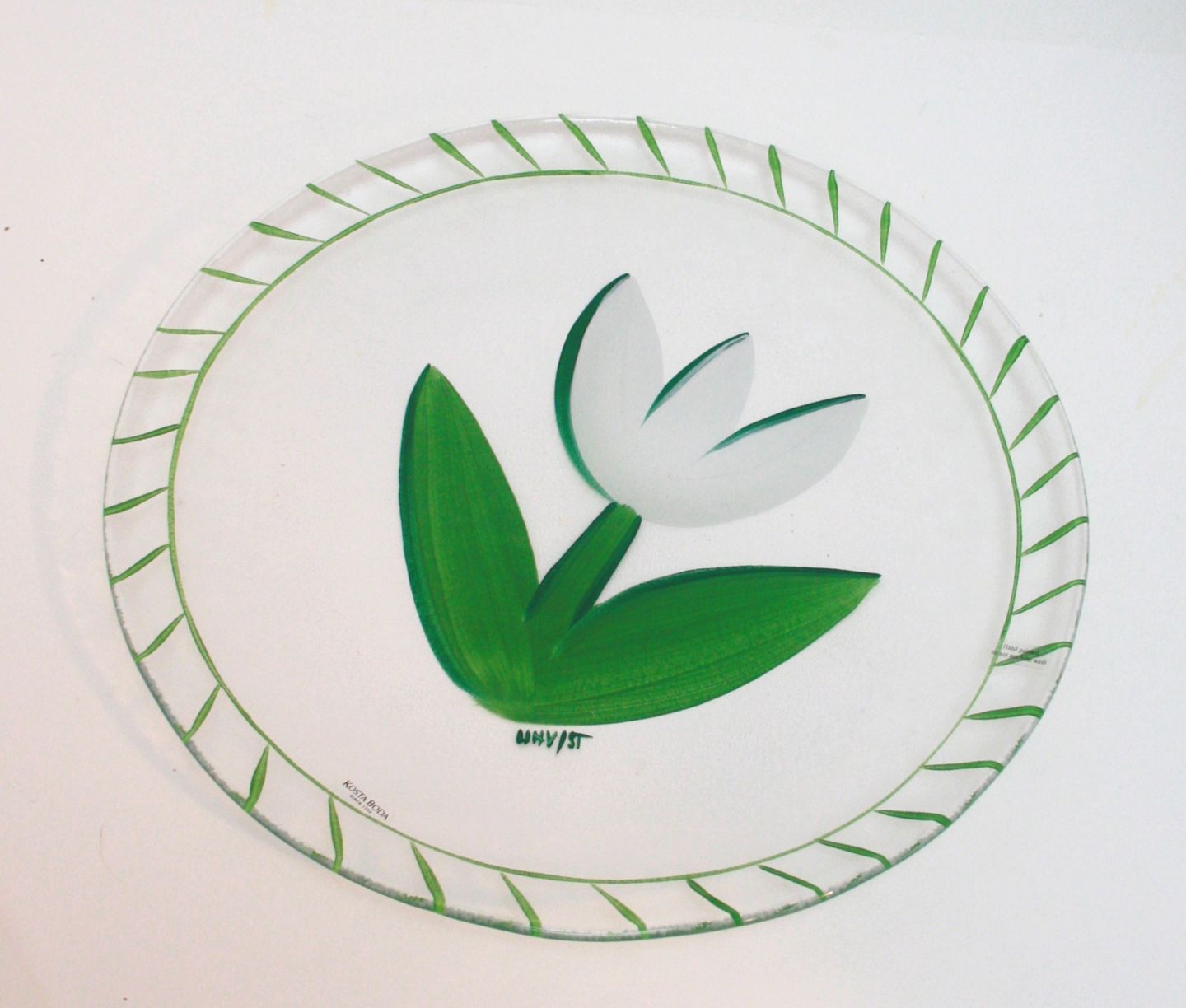 Kosta Boda, Tulipa fad klart glas med hvid tulipan. Designet af Ulrica Hydman-Vallien. Diameter 32,5 cm. Pris: 325 kr. stk.