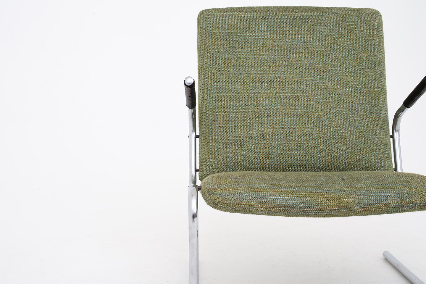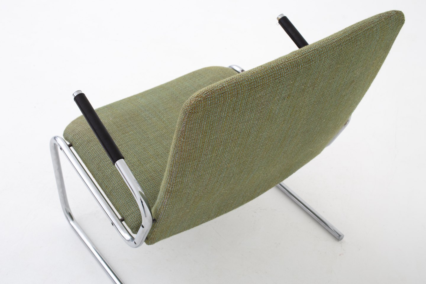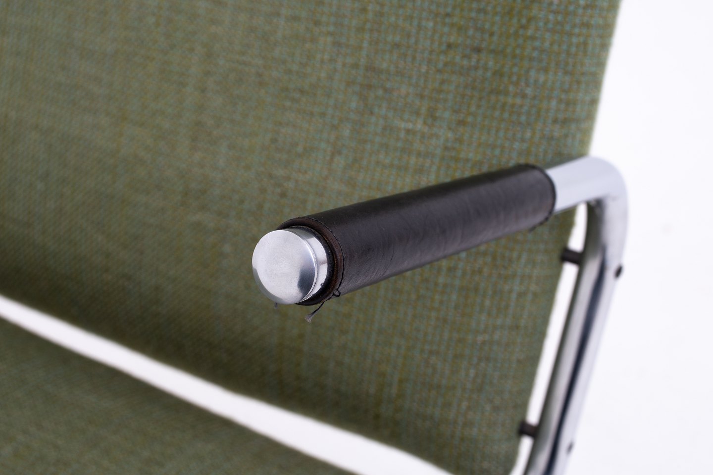 Lænestol med frisvingerstel i forkromet stål, betrukket i grøn uld og armlæn med sort læder