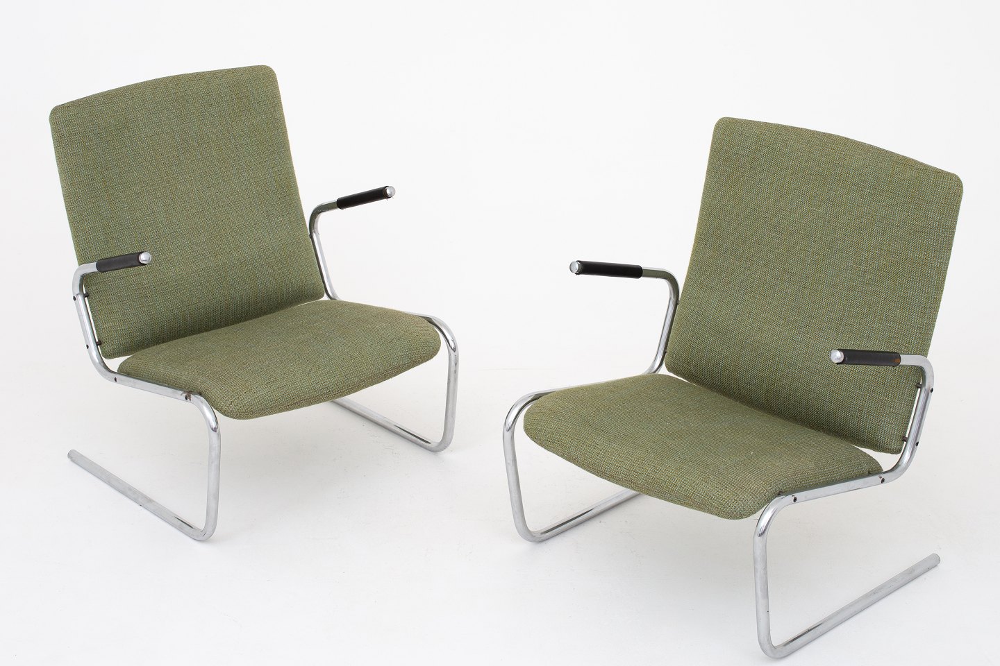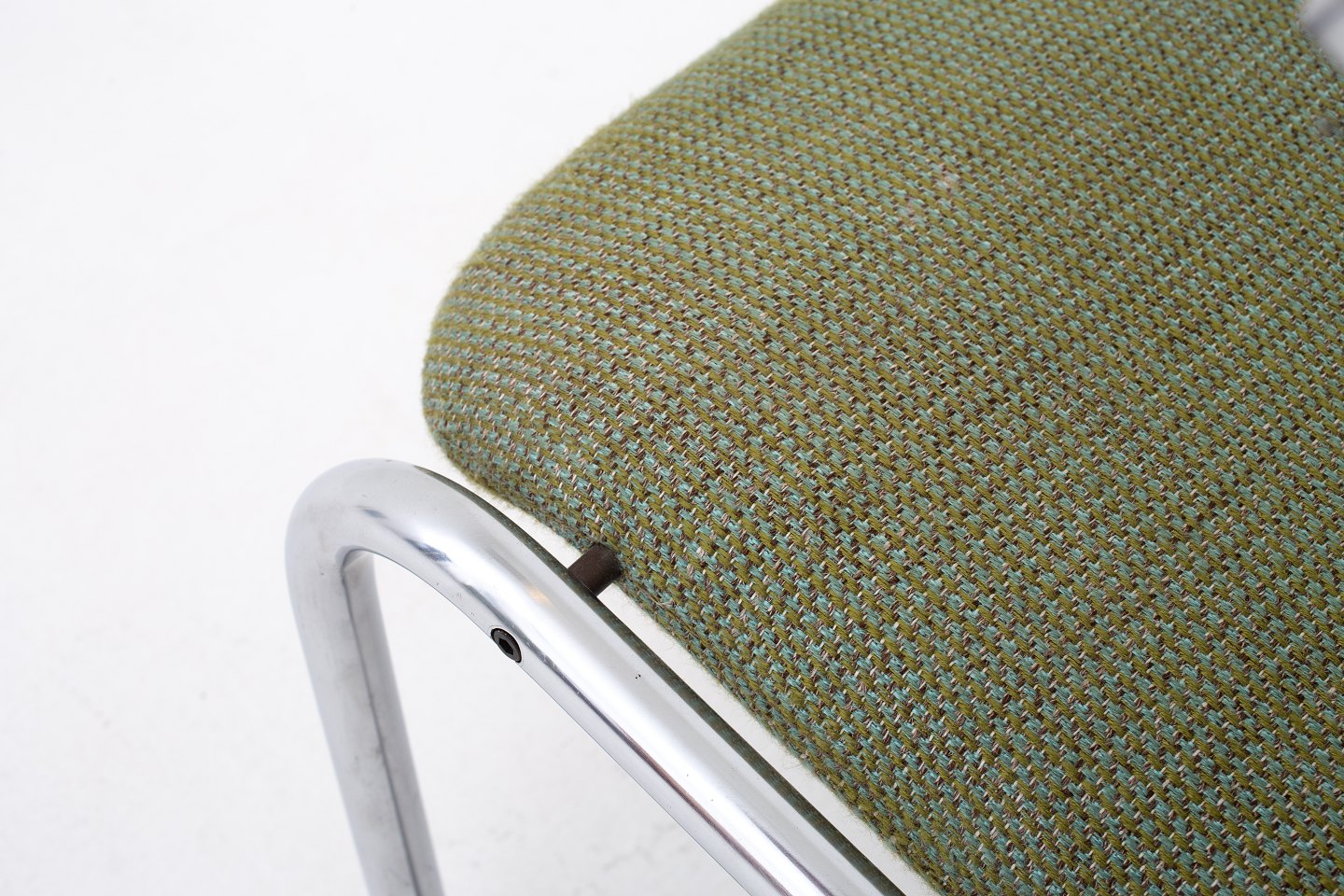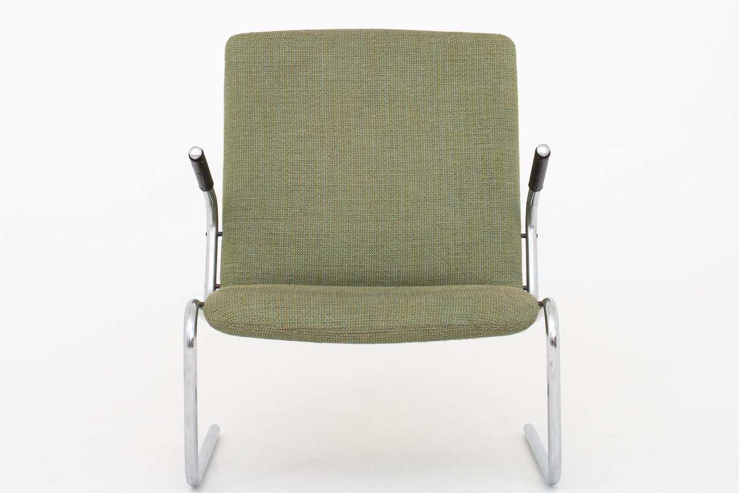 Lænestol med frisvingerstel i forkromet stål, betrukket i grøn uld og armlæn med sort læder