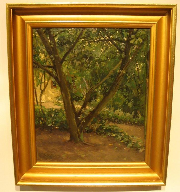 Victor Qvisttorff (1882-1953) Danmark. Parti fra en have. Olie på plade. Sign.: V. Qvistorff 1927 den 1.st. Juli. 34 x 29 cm. På bagsiden af pladen: Stempel fra kunstnerens dødsboauktion.