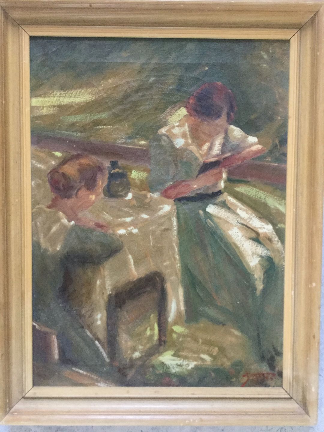 Maleri af Chr. Faber - læsende mor og barn ved havebord.