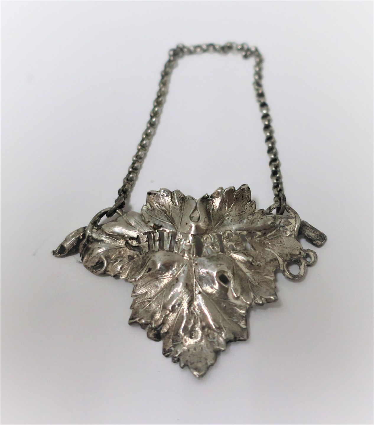 Vinskilt. Engelsk til sherry. Sterling (925). Produceret Birmingham 1899.