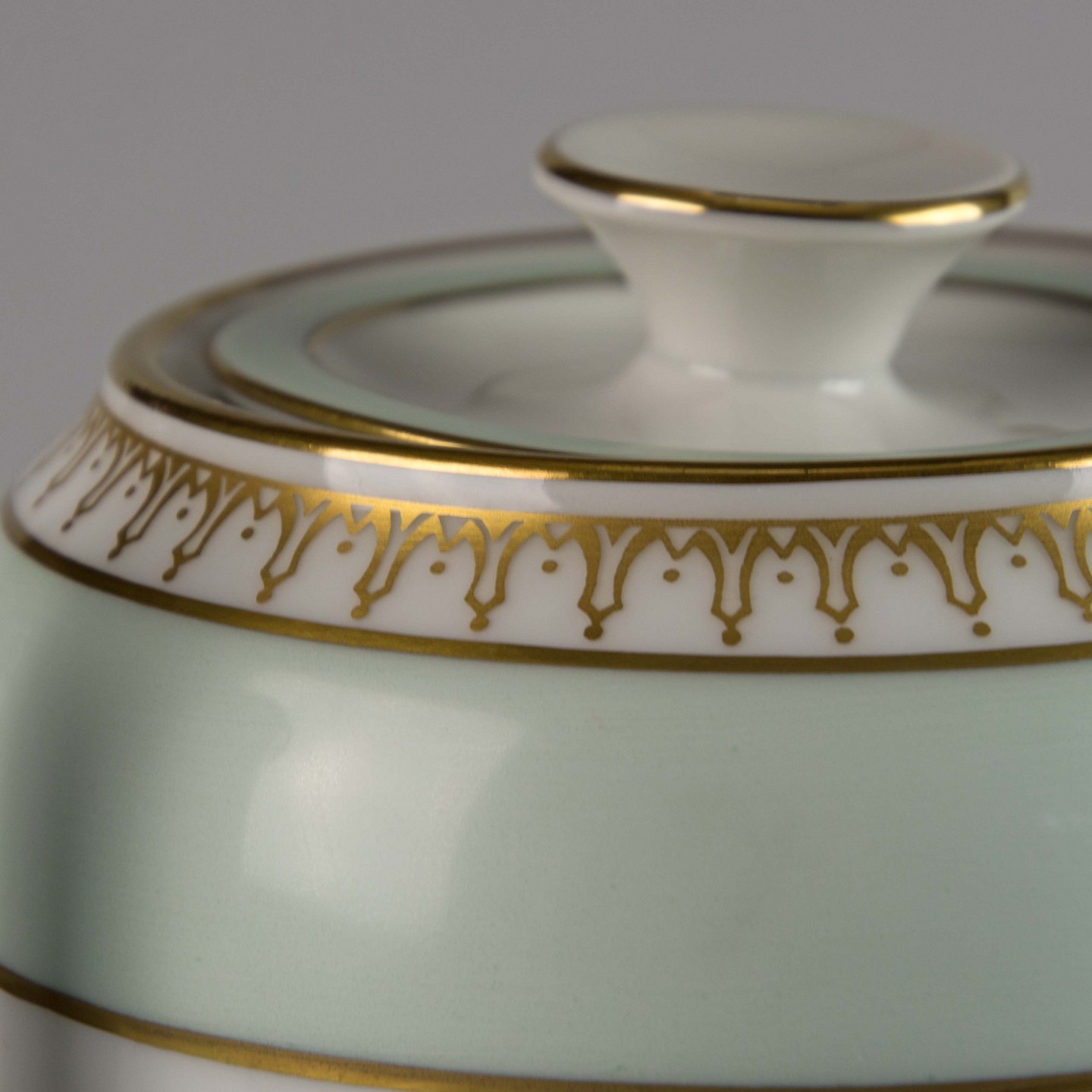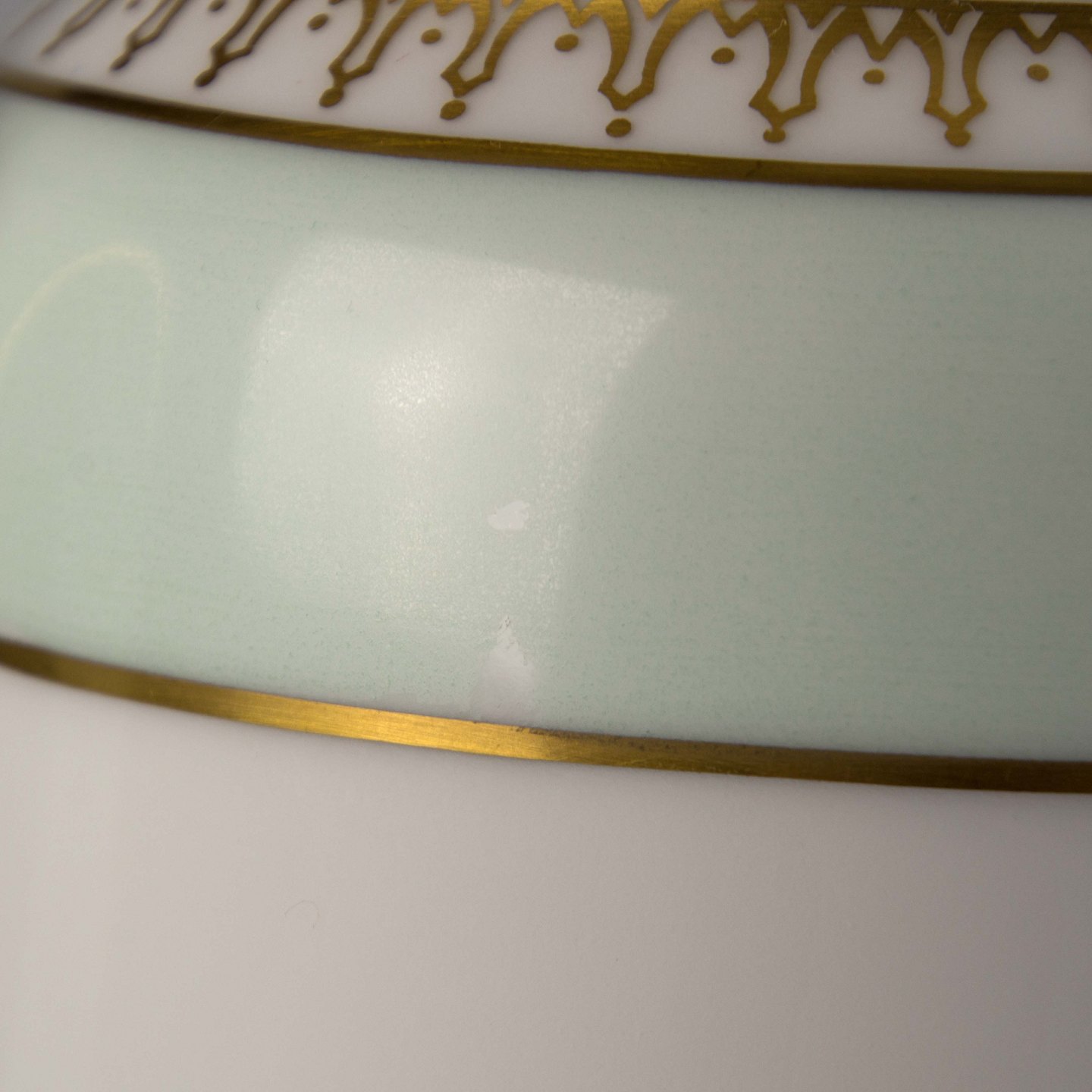 Kande i hvidt porcelæn med lysegrøn kant og gylden dekoration