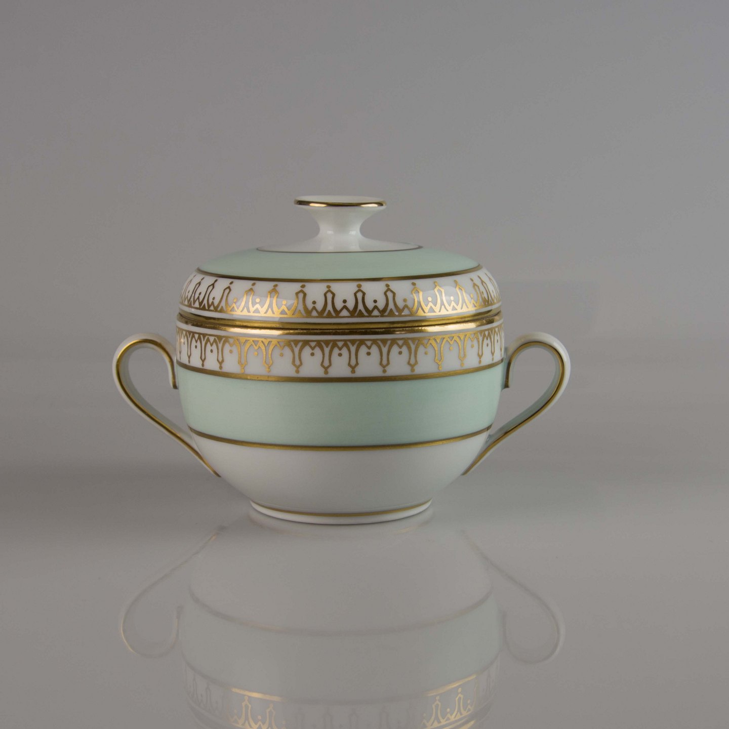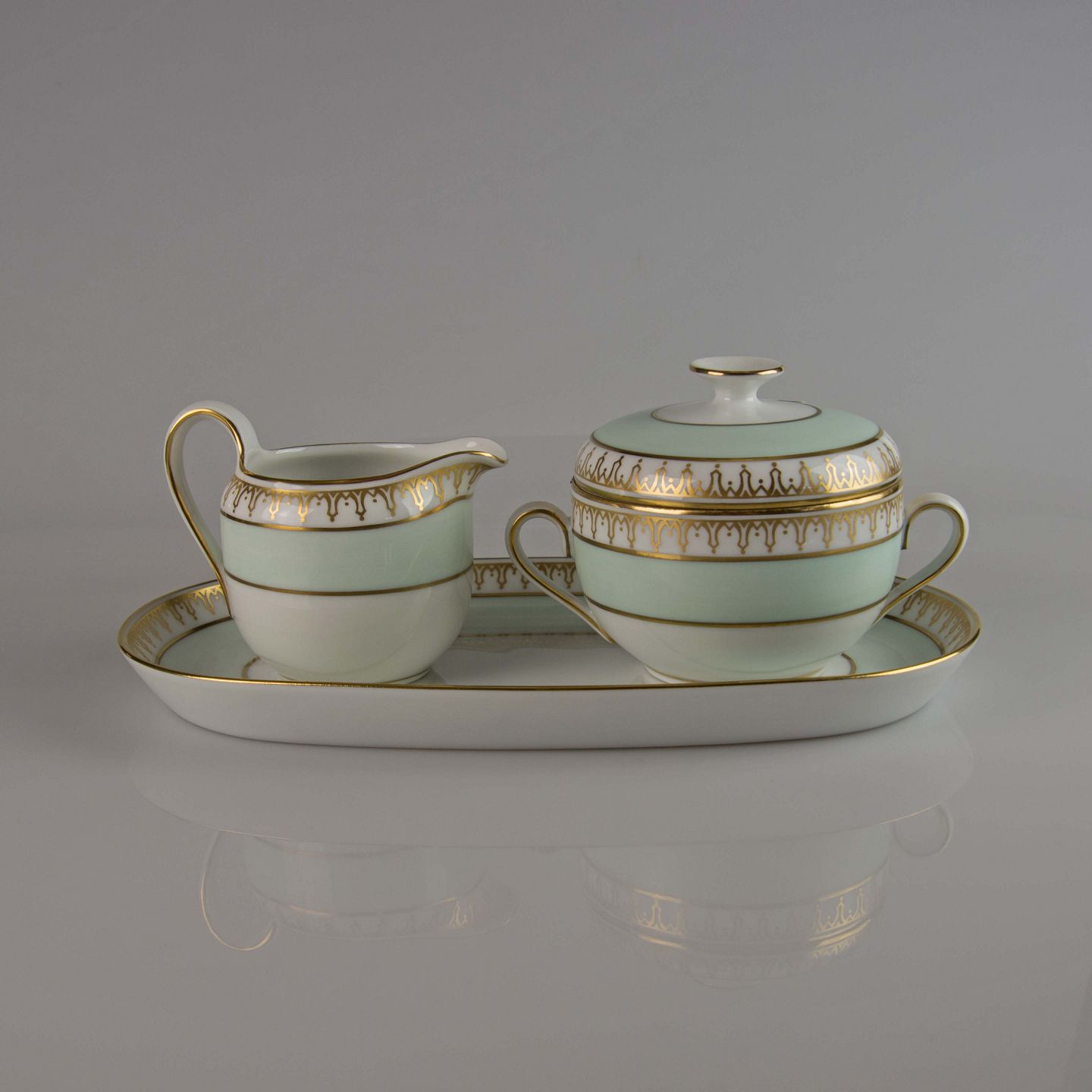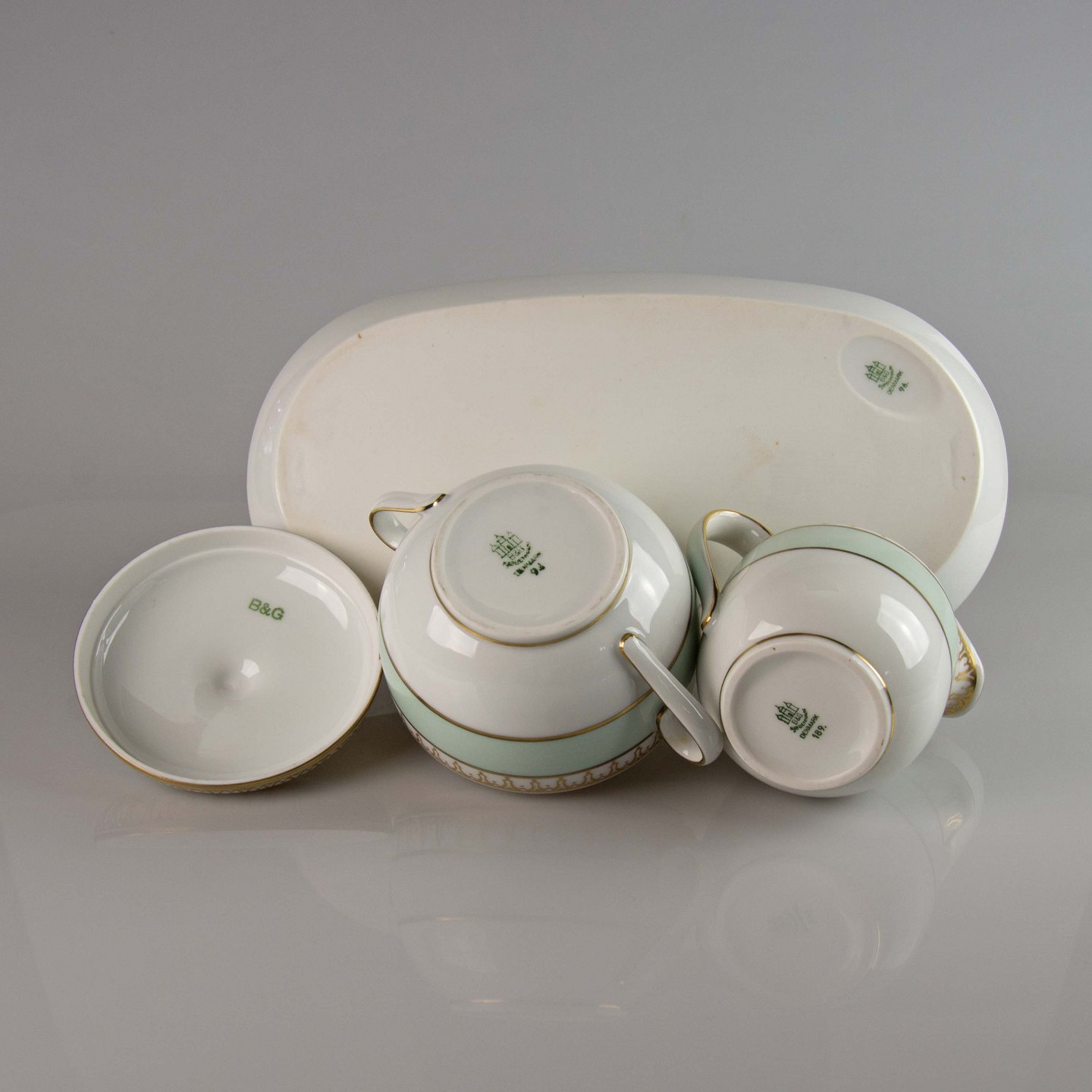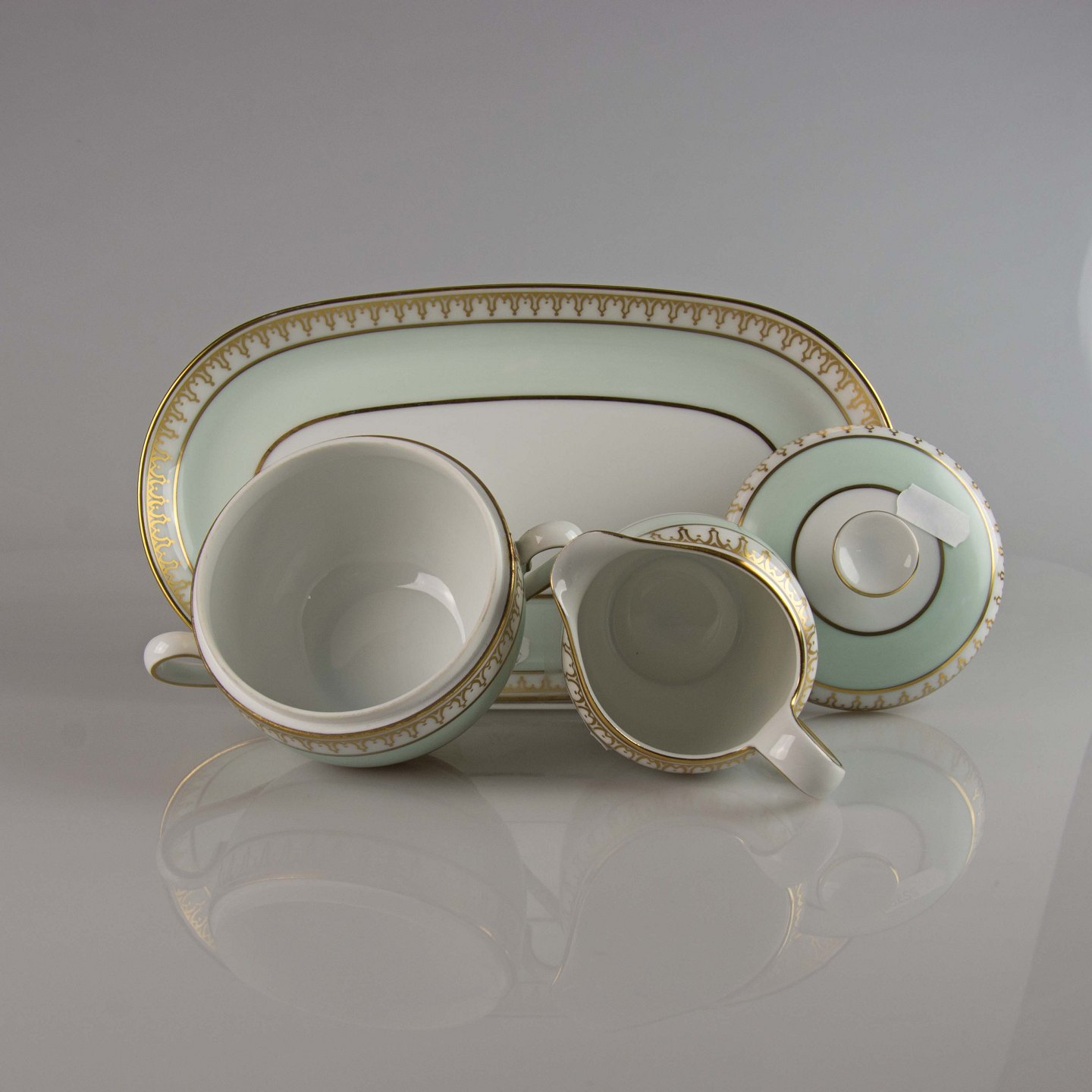 Stel i hvidt porcelæn med lysegrøn kant og gylden dekoration