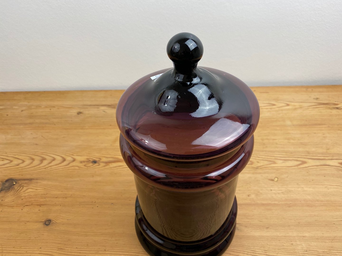 The purple glass pharmacy jar is 27 centimeters high incl. the lid and 14 centimeters wide.
