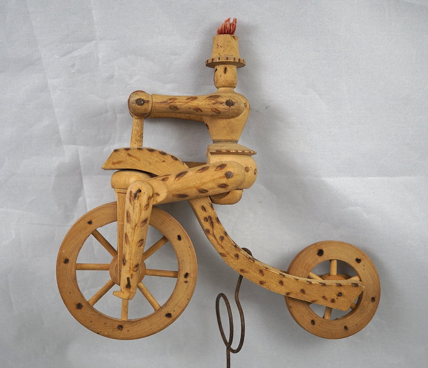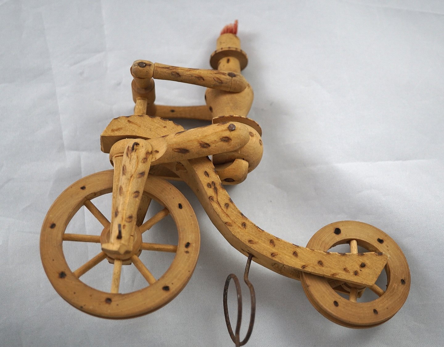 Cykelmand i træ. Cyklen er beregnet til at glide på en udspændt snor, der er en kugle nederst, for at holde balancen. Cykel og mand er lavet i træ
