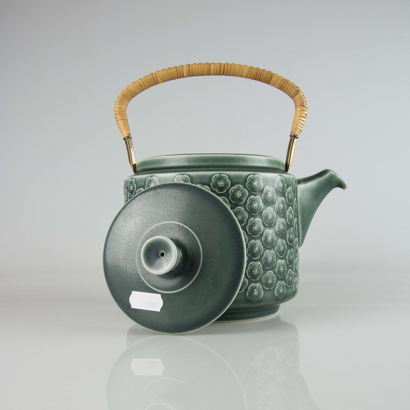 Stel i blågrøn stentøj med blomster motiver og håndtag i messing beklædt med bambusflet.