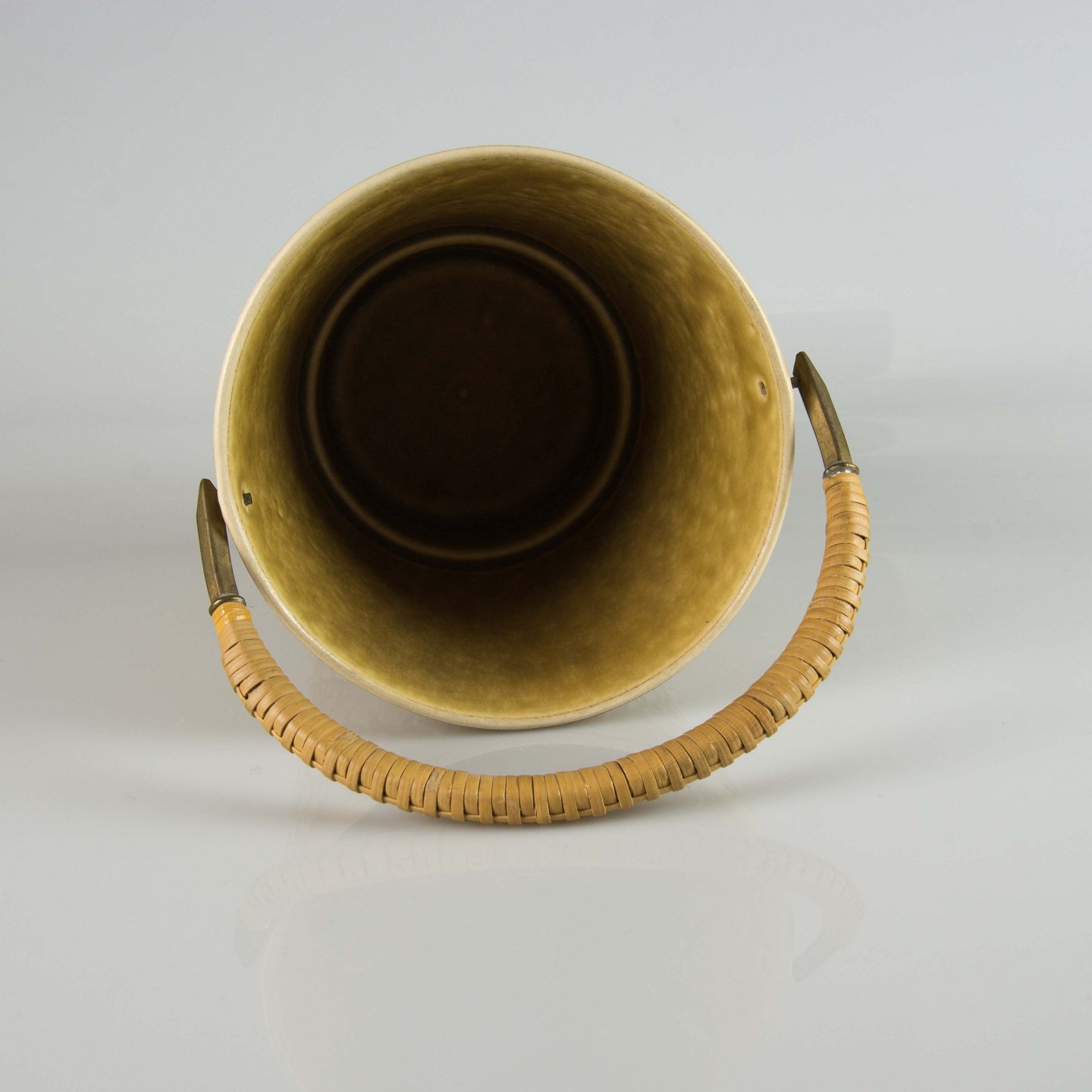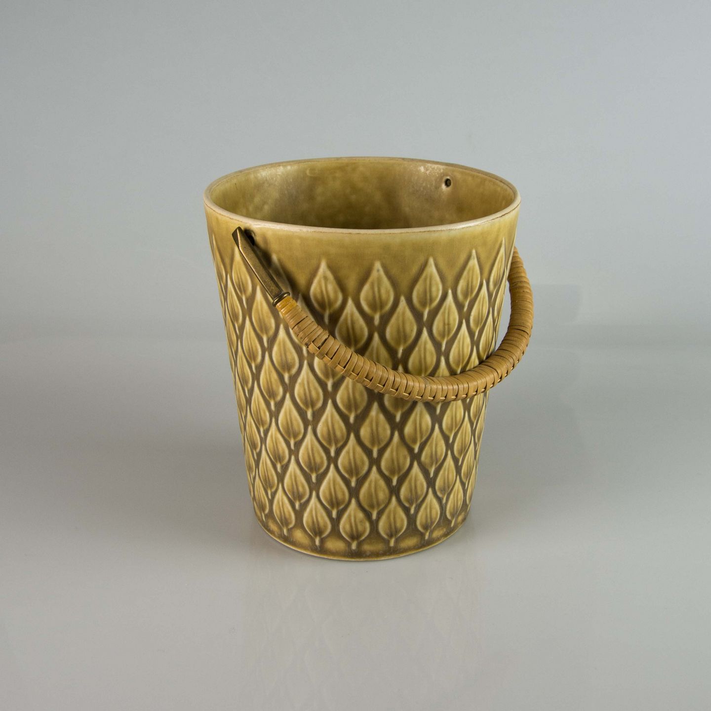 Køler i gulligt stentøj med motiv af blade og håndtag i messing beklædt med bambusflet.